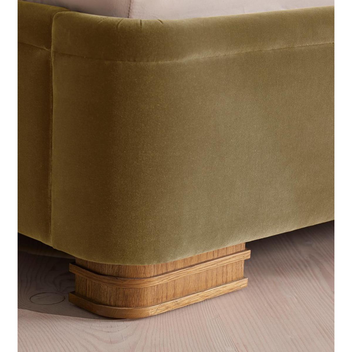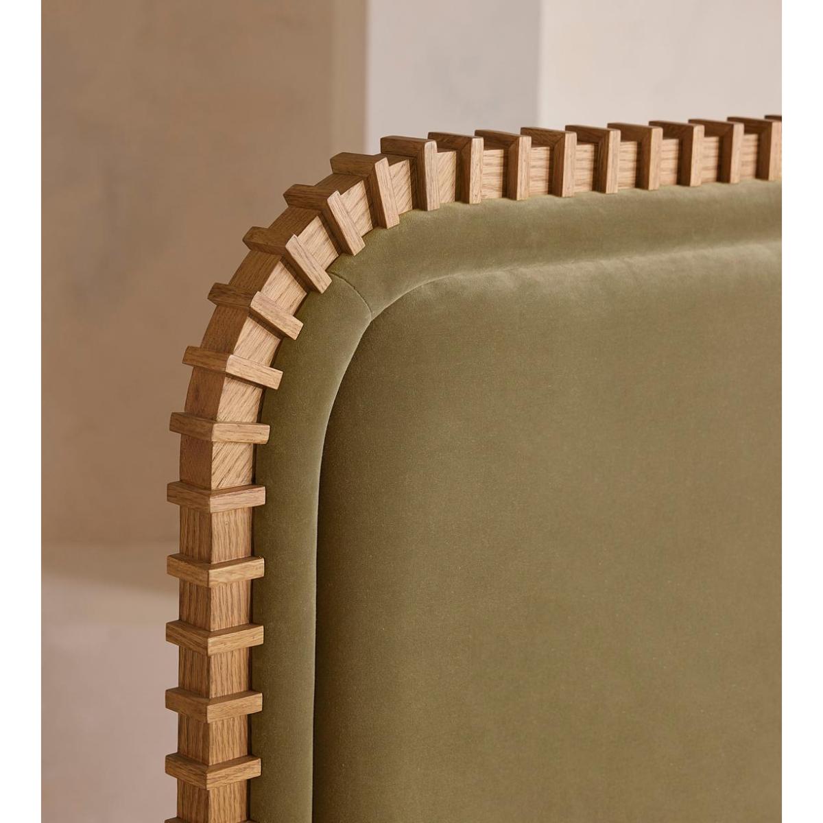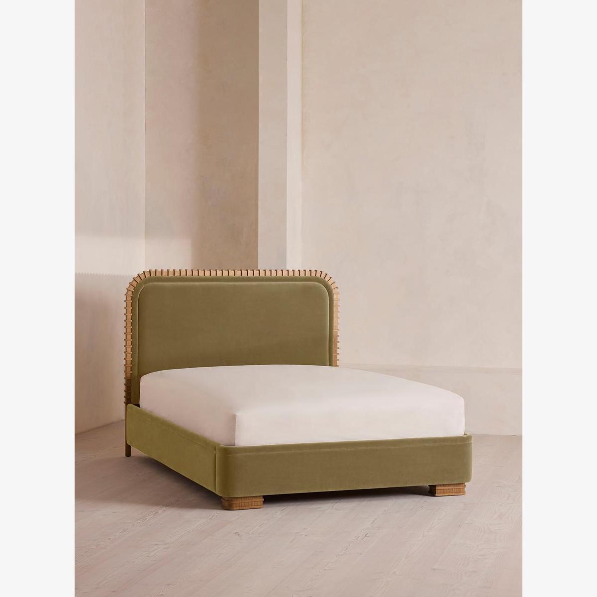 Made from solid oak, an oversized, curved headboard is characterised by intricate carved detailing. Inspired by the calming bedrooms of Soho House Rome, the Angus bed is fully upholstered in soft velvet in a variety of bespoke colour options. Made from solid oak, its frame is characterised by an oversized, intricately carved headboard that creates a statement design piece for your room.