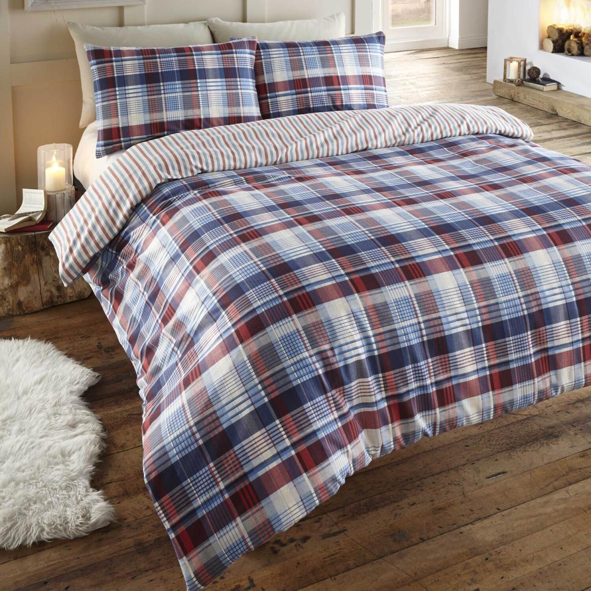 A sumptuous and comforting check, with co-ordinating stripe reverse available in navy and plum.