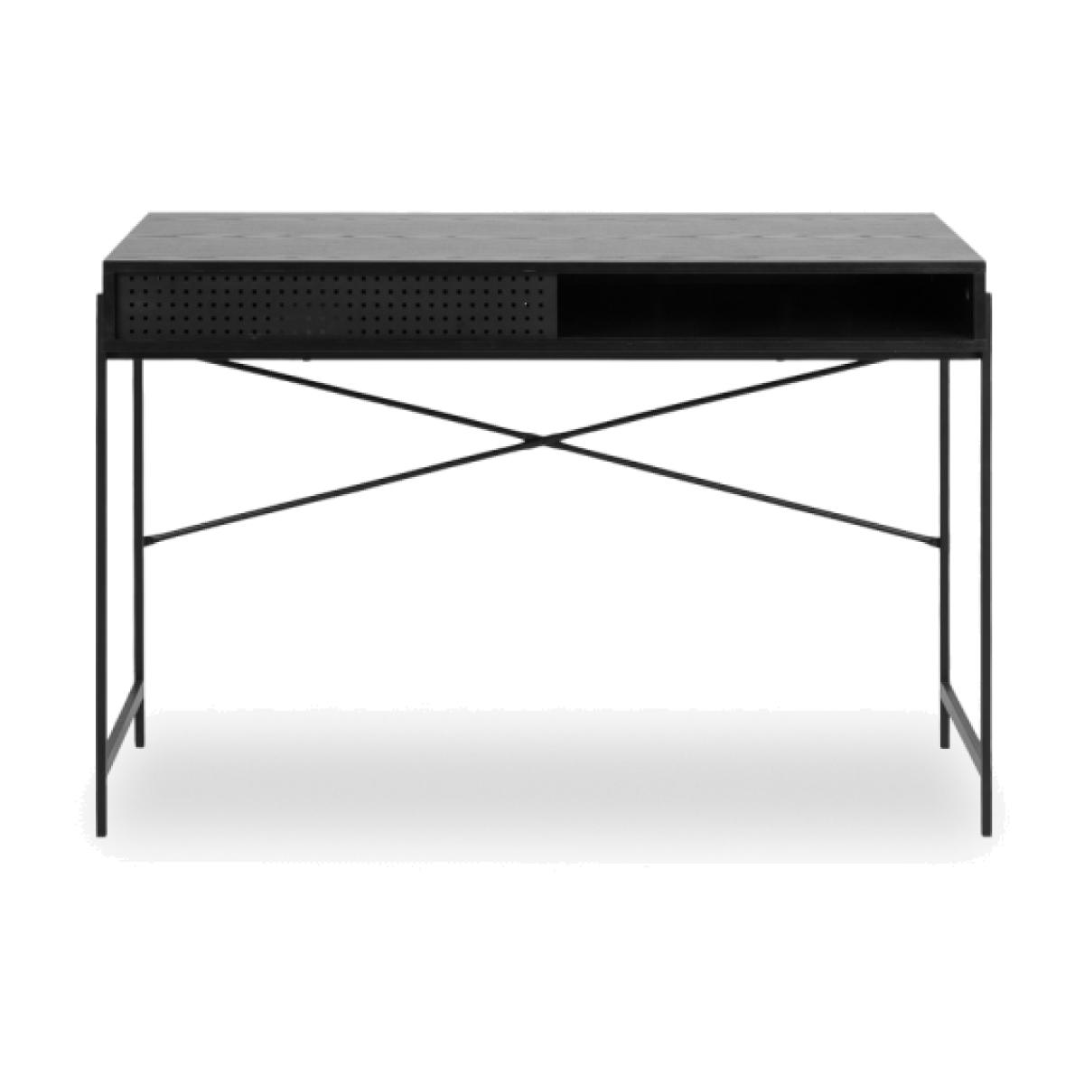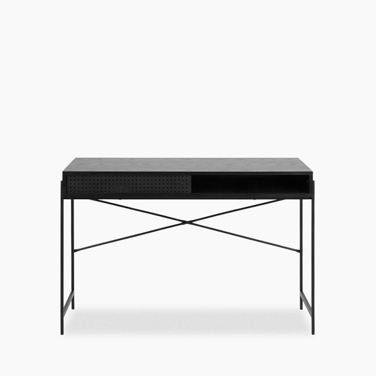 Functionality and contemporary style is everything when it comes to the Angus compact desk, combining an ash wood effect in black with a perforated metal design that makes an industrial statement. The modern storage feature across the front offers ample room to hide away your gadgets, making it perfect for small spaces with slick sliding front panel.