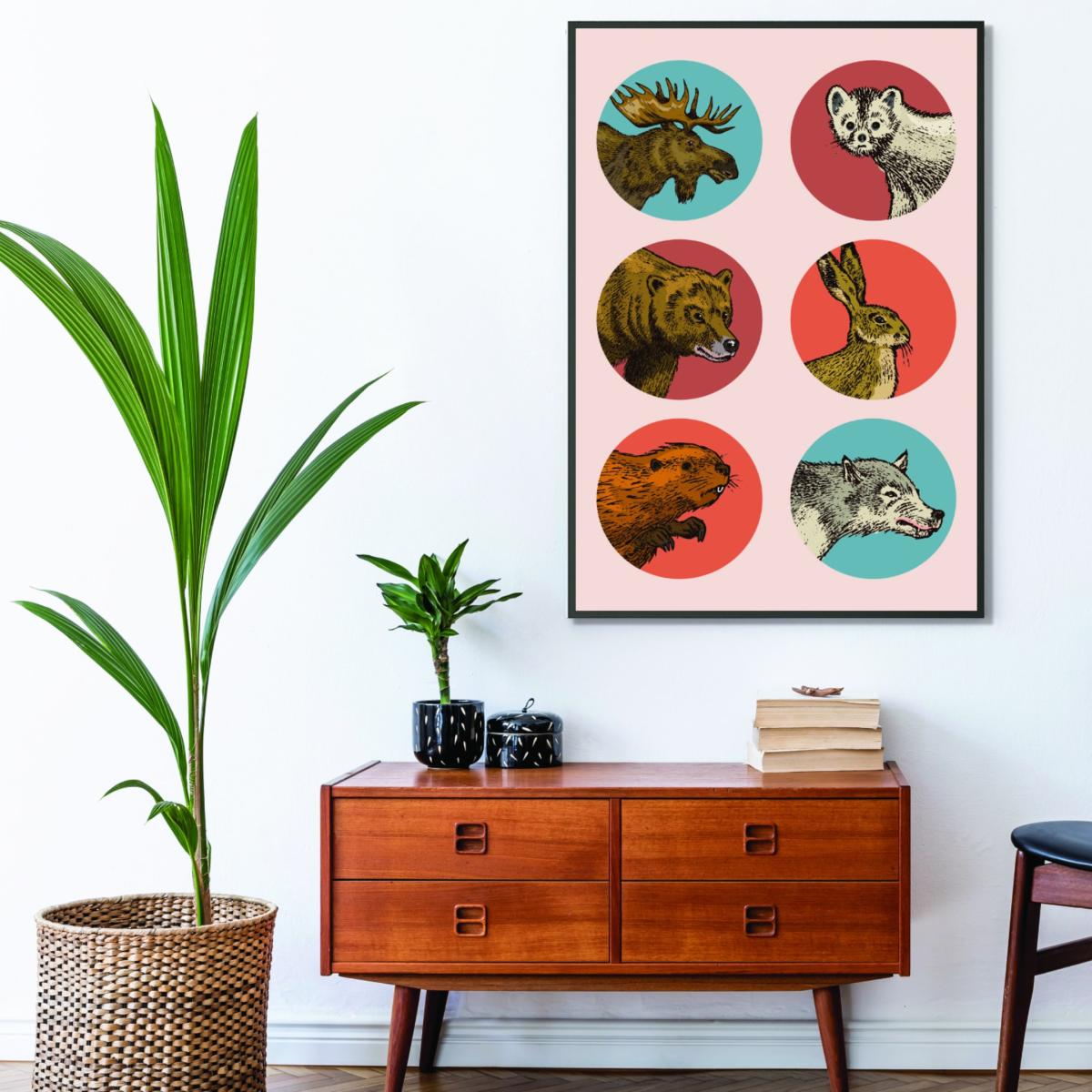 I really like the animal circles print because it brings a playful yet sophisticated touch to any space. It works particularly well in children's bedrooms, playrooms, or even in more eclectic living areas where a touch of colour and personality is welcome. For styling, consider pairing it with neutral walls to make the artwork pop, or mirror its vibrant hues with accessories like cushions or throws in similar colours. This piece is also versatile enough to complement both modern and vintage interiors, making it a flexible addition that can be styled with minimal fuss while adding visual interest.