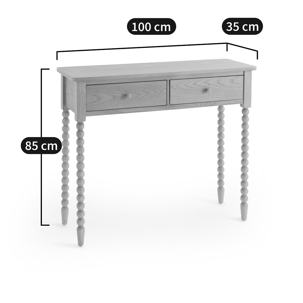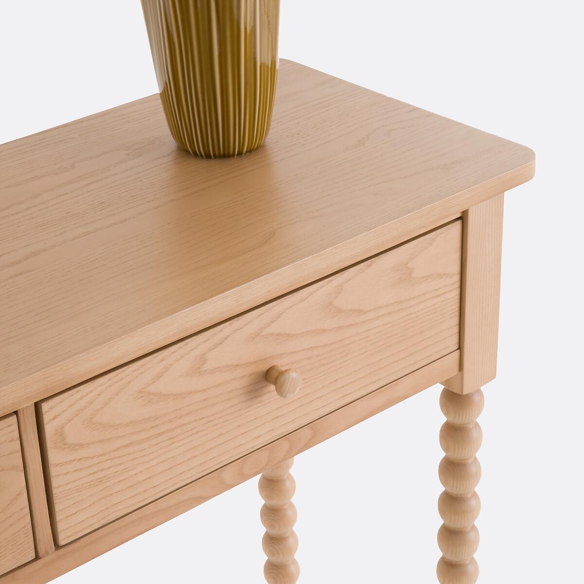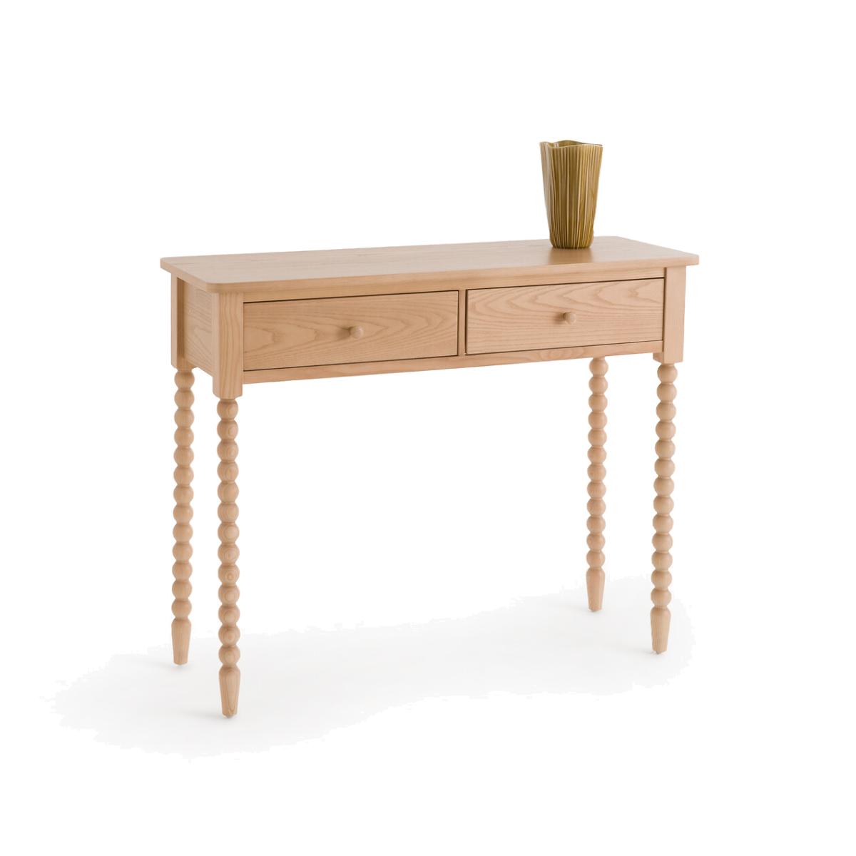 In solid ash and FSC® ash veneer. The Anina console combines the spirit of a family home and a revisited traditional line. Its turned wooden legs add a touch of elegance to your interior. Product Details • FSC® ash veneered MDF top, nitrocellulose varnish finish • Turned legs and handles in solid FSC® ash, nitrocellulose varnish finish • 2 drawers: facades in FSC® ash veneered MDF and solid ash, nitrocellulose varnish finish. Dimensions • Width: 100cm • Height: 85cm • Depth: 35cmDelivery:. This product is sold for self-assembly. It will be delivered to your door. Note! Please check that all access points are large enough to accommodate your delivery (doors, stairs, lifts). • WOOD FROM SUSTAINABLY MANAGED FORESTS. FSC® certified wood comes from forests that are environmentally, socially and economically well managed. Parcel dimensions and weight • 1 parcel • L109 x H31 x D44cm. 20.6kg