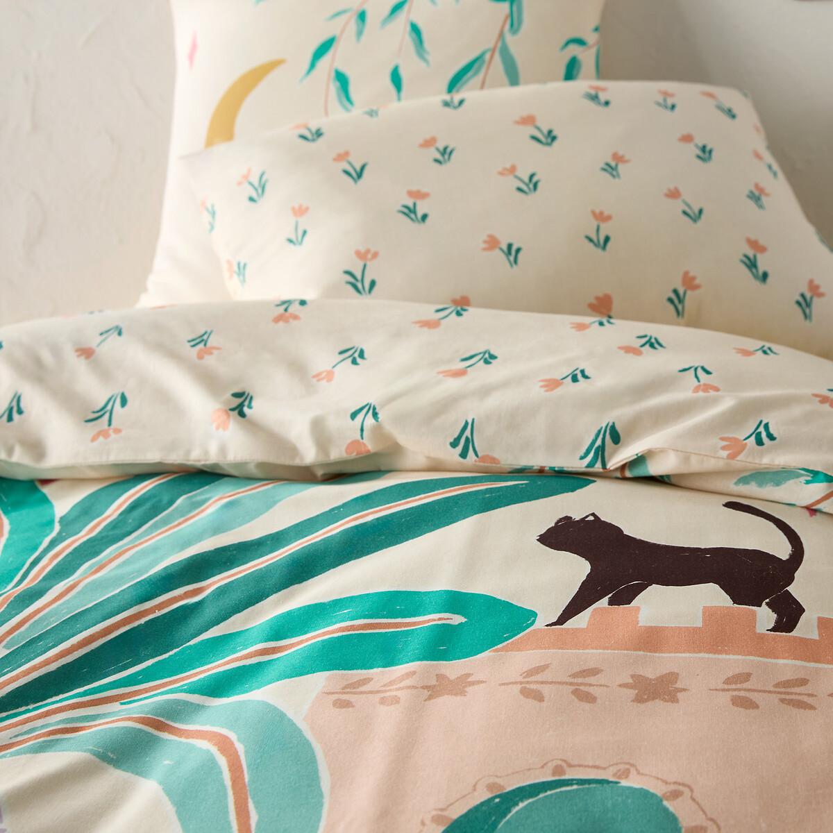 Like an illustration of holiday memories, the Anis duvet cover is adorned with patterns on one side, highlighted by the quality of the digital printing. Plant and palm tree motifs harmonise with a coordinating pattern on the reverse.100% cotton bed linen, a creation by La Redoute Interiors. Cotton is part of our daily lives. We love it for its suppleness and softness. Easy to live with and maintain, it is ideal for beds for young and old alike!Product Details • 100% cotton • 50% virgin cotton, 50% recycled coton • 144 thread count • Palm tree print on the front / small flower patterns on the back • Straight buttoned hem Match this item with the rest of the bedding in the range for a stylish bedroom. And you can mix and match it with different colours and styles from our other bedding ranges when you want to change things up and create your own unique look. Care Advice • Machine washable at 40°C • By washing your laundry at 40°C instead of 60°C, you limit energy consumption. Sizes • 140 x 200cm: Single • 160 x 210cm : Double • Recycled cotton. Using recycled cotton is all about conserving resources and reducing waste. • OEKO-TEX® Standard 100. Standard 100 certification by OEKO-TEX® tests textile products for harmful substances via an independent, international label.