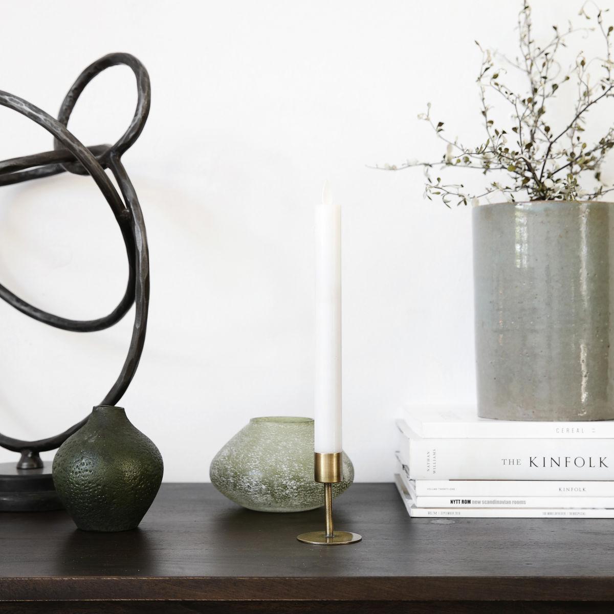 I love this candle holder for its sleek antique brass finish, which adds a subtle touch of vintage charm while remaining versatile enough for contemporary settings. It works particularly well in Minimalist, Industrial, or Scandi interiors, where its clean lines and warm metallic tone can serve as a understated focal point. Practical styling tips include grouping a few on a tray with other brass or neutral-toned accessories for a cohesive look, or placing one on a side table or mantelpiece to create a cosy ambiance. Its size makes it ideal for small to medium spaces, and it’s equally at home with tall, slender candles or simple taper styles for a refined touch.