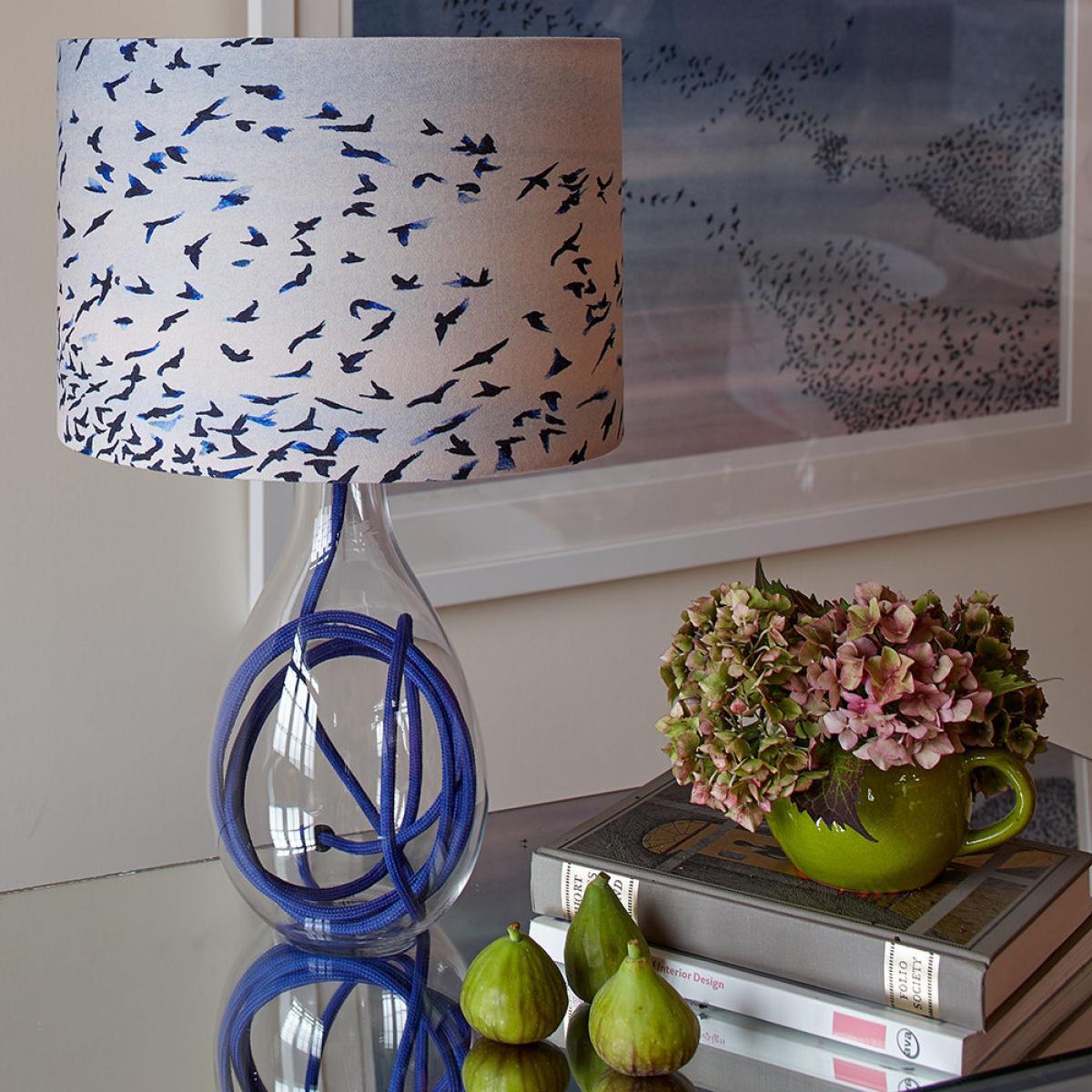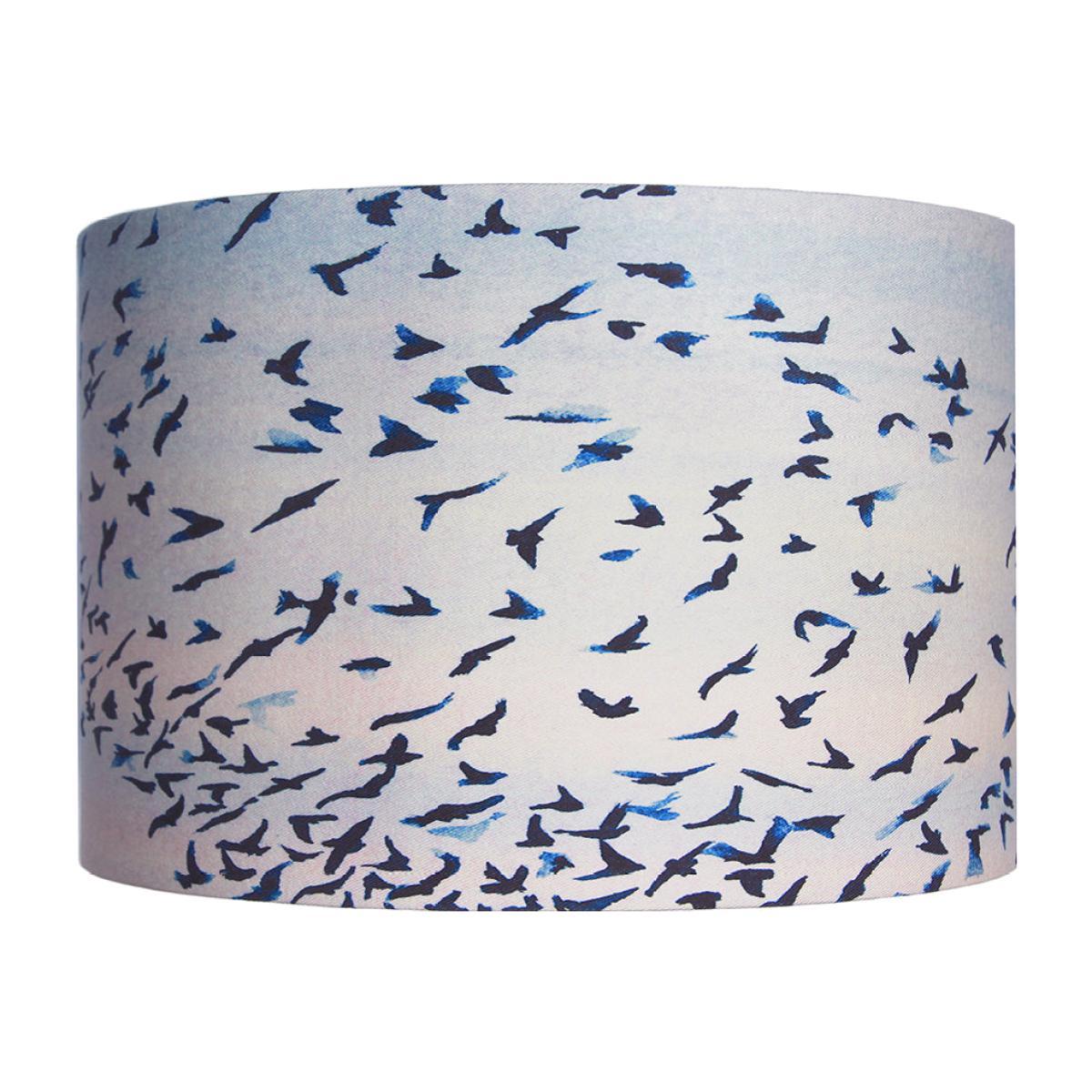 Add stylish finishing touches to any room with this Murmuration Lamp Shade from Anna Jacobs. Its crisp image has been digitally printed onto 100% cotton and depicts a beautiful illustration of a flock of birds taking flight. Each bird has been coloured in various blue shades; with these tones enhanced further when a bulb is lit inside. Created by designer and artist Anna Jacobs, this handmade lamp shade is available in three sizes and makes a wonderful addition to any home.