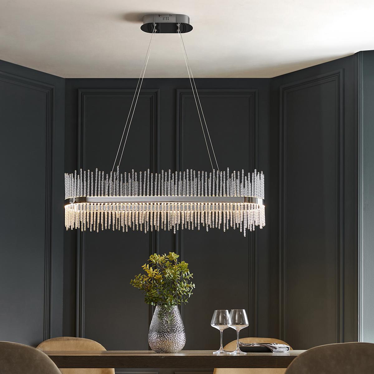 Bring a bold touch of modern grandeur to your space with the glorious Anna Linear Pendant. Angelic by nature, this glass rod LED pendant combines a brushed chrome detailing with ornate twisted glass rods to create a look.