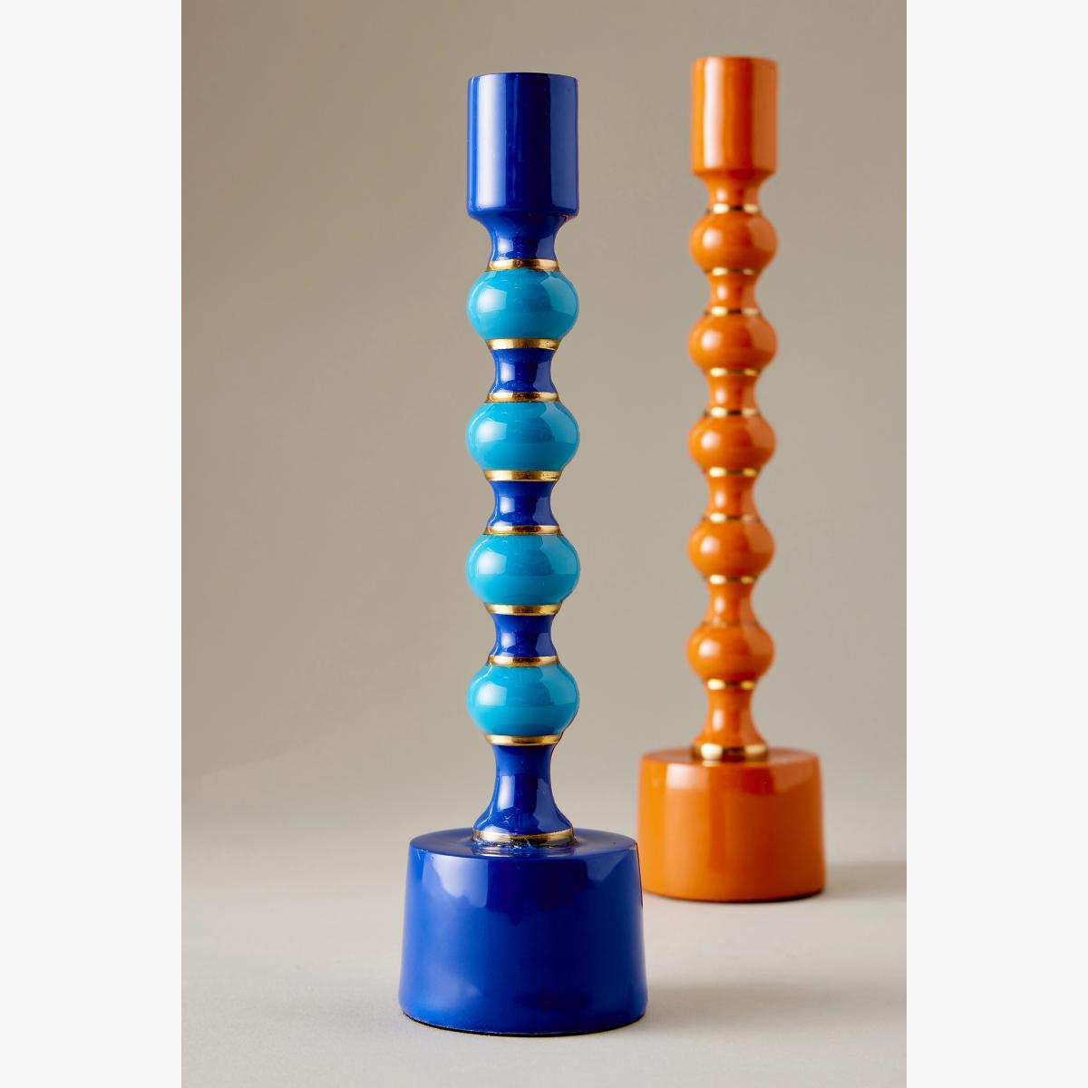 I love this candle holder for its bold, sculptural shape and striking colour palette, which adds a playful yet sophisticated touch to any space. It works particularly well in modern or eclectic interiors, where its vibrant hues can serve as a statement piece on a sideboard, console table, or even a dining table as a centrepiece. Practical styling tips include pairing it with minimalist decor to let its colour and form stand out, or arranging it alongside greenery or other textured accessories for a layered look. Its sturdy base makes it versatile enough for both indoor and covered outdoor settings, and positioning it at different heights using smaller candles can help create a dynamic display.