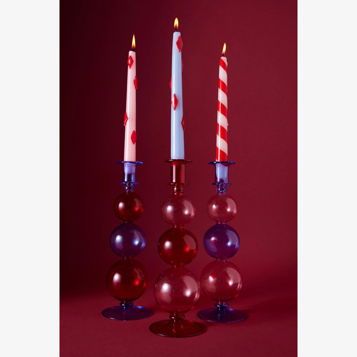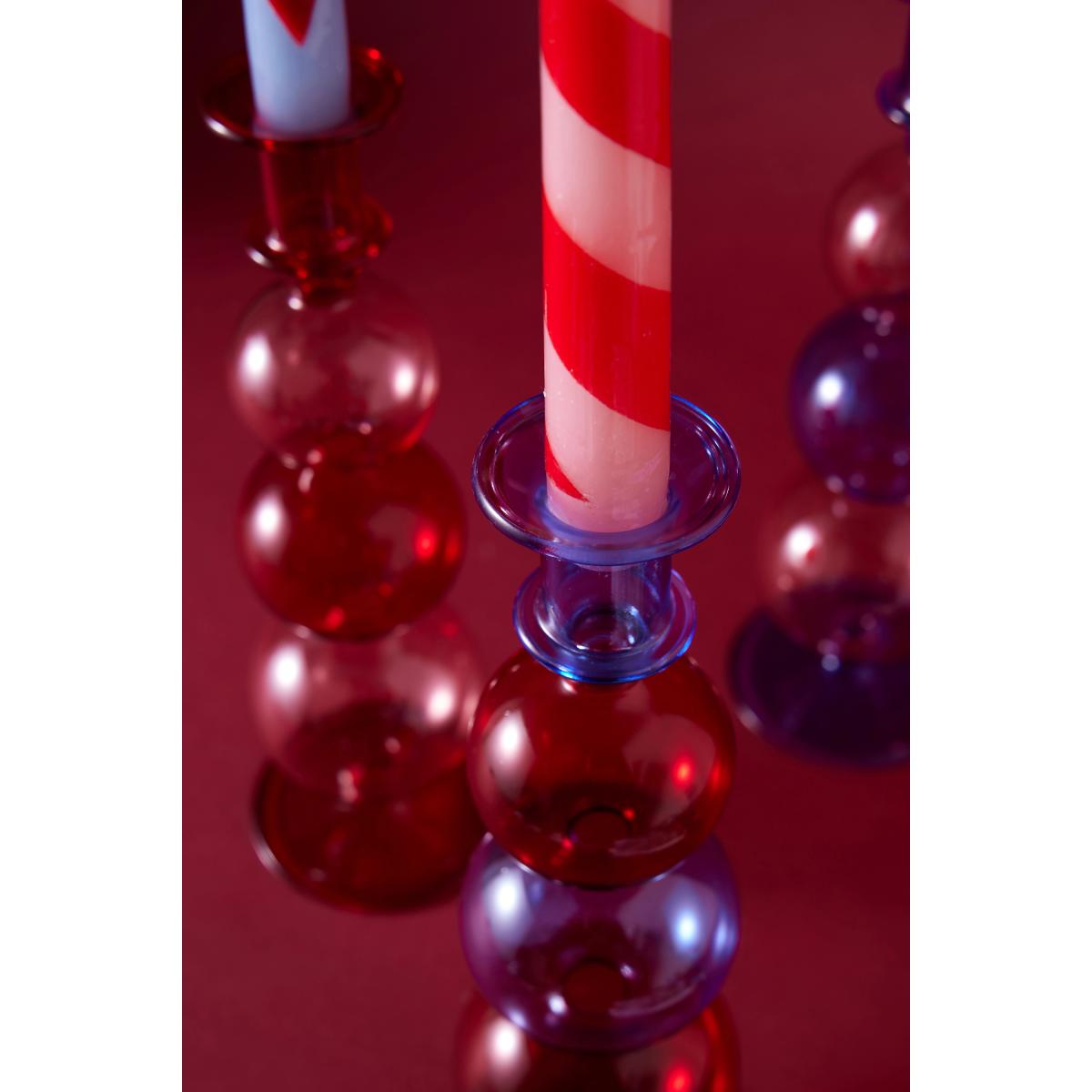 I love this candle holder because of its playful, modern take on traditional candle display. It's particularly versatile-works well in both contemporary and eclectic interiors-and adds a sculptural touch to side tables or mantels. For styling, I suggest pairing it with slim, colourful taper candles like those shown, which add height and visual interest. It can also be layered with other decorative objects or used as a centrepiece for festive dinner settings. Its unique bubble glass design makes it a standout piece that brings a contemporary edge to any space without feeling overdone.