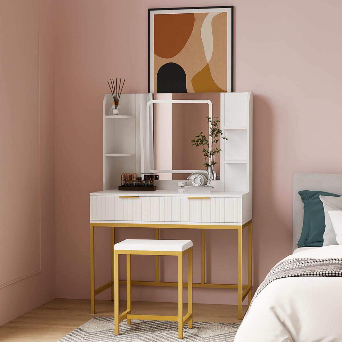 Upgrade your bedroom with the White and Gold Dressing Table Set. This sleek, compact set features a modern dressing table with an integrated LED mirror, offering bright, even lighting for flawless grooming. The LED mirror includes three adjustable lighting tones, from cool white to warm. With practical side shelves and two drawers, this set provides ample storage for your beauty products. The matching padded stool adds comfort and completes the set, while the easy-to-follow assembly instructions make setup a breeze. Perfect for smaller spaces without sacrificing style or storage.