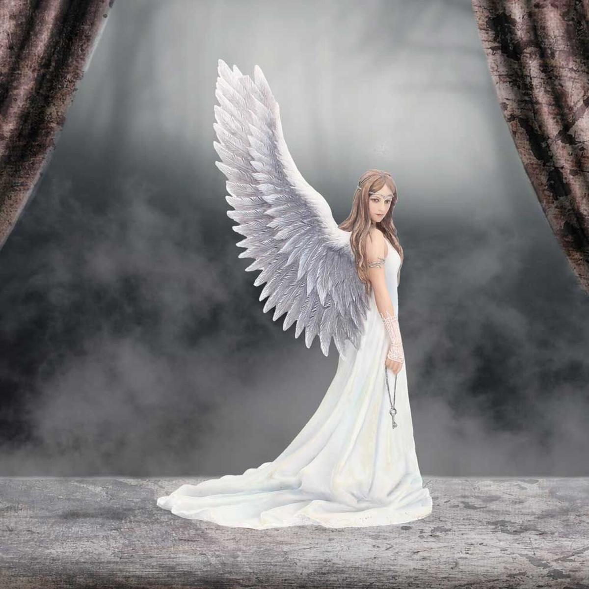 From Fantasy brand Nemesis Now's giftware collection, this enchanting angel figurine comes from the imagination of world-famous Gothic and Fantasy artist Anne Stokes. Standing tall, this chestnut-haired angel looks to her right, her long hair flowing over her shoulders past her metal diadem. Her right hand hangs down by her side, holding an iron key by a chain as her long white dress flows down and along the ground behind her. Long white wings stretch out, erupting from between her shoulders. Cast in the finest resin before being lovingly hand-painted, this enchanting angel figurine is a fantastic gift for any who feel they need some guidance in their life.