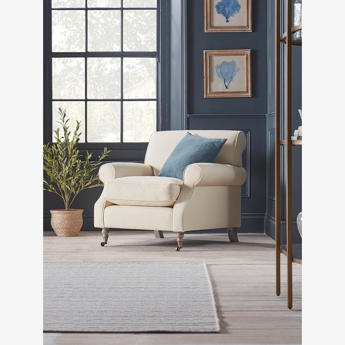 I’m a fan of this Annecy chair for its clean roll arms and soft blue stripes - it adds interest without feeling busy. It works well in coastal, cottage or Scandi-inspired spaces, especially alongside oak or rattan side tables and natural-fibre rugs. For a practical setup, drape a linen throw over one arm, pop on a neutral scatter cushion to pick out the stripe, then finish with a slim brass floor lamp and a potted plant to create a cosy reading corner.