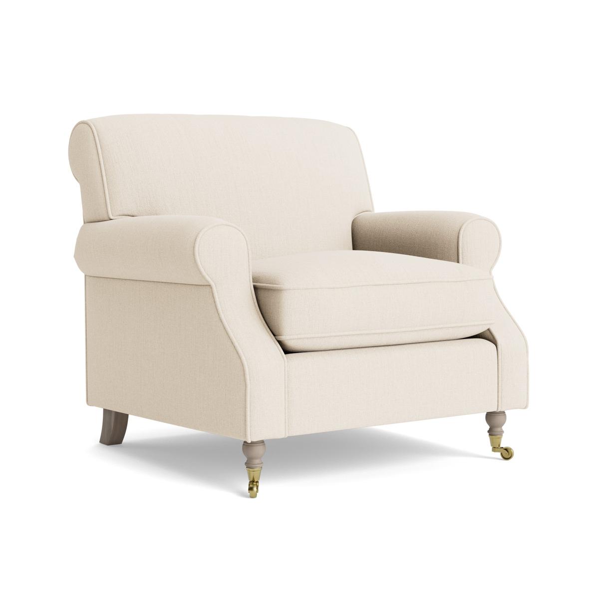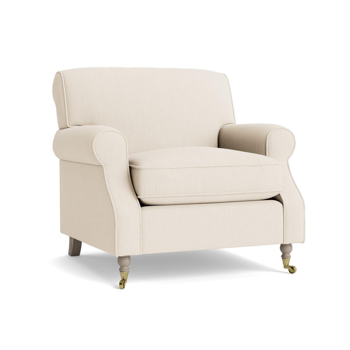 Our Annecy armchair offers sophisticated refinement and an ageless look. A tailored back provides firm support while the base cushions have a foam and feather fill for a squishy inviting seat. P-shaped arms are neatly piped for a premium finish and turned wooden legs on castors provide an extra touch of elegance to this handsome armchair. A matching sofa is available as a two or three seater option and the Annecy range also includes an ottoman. Pictured here in our blue and white stripe material, our Annecy collection can be upholstered in a choice of distinctive shades and fabrics to suit your style. Read our Upholstery FAQs View our full Upholstery Terms and Conditions