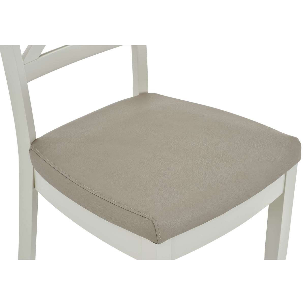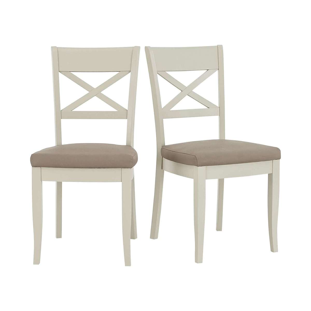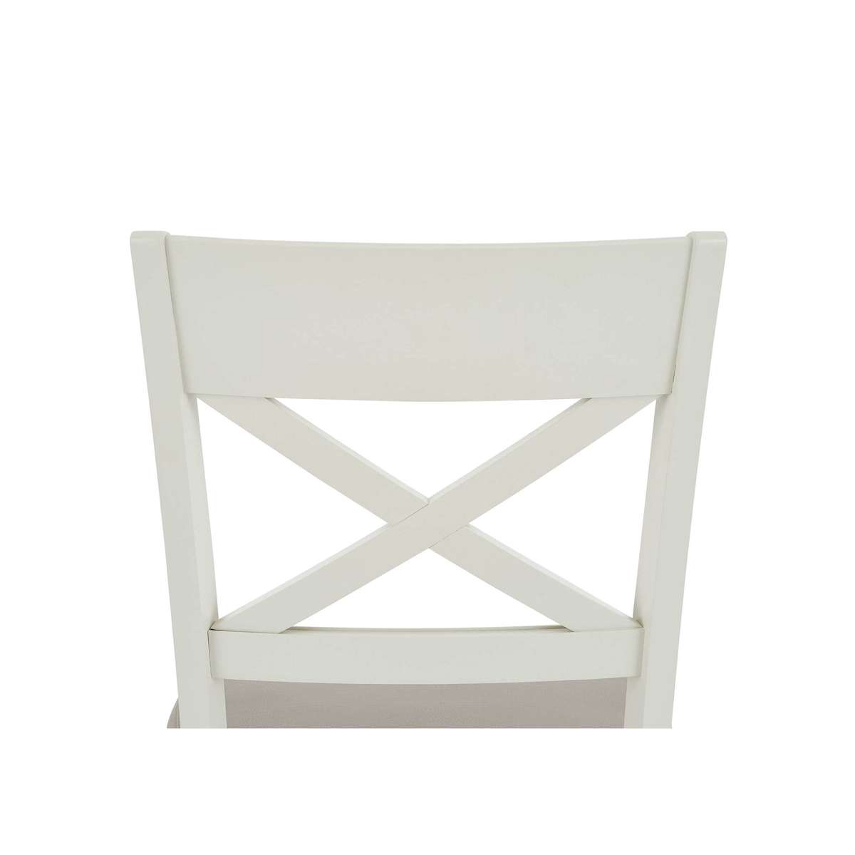 Equally at home in a formal dining room and a relaxed kitchen diner, these lovely pair of Annecy cross back chairs always brings a touch of elegance. Why you'll love it Pair of faux leather cross back dining chair showcases timeless dining room style. Elegant design details include a broad top rail and tapered legs. Comfortable seat upholstered in easy- care grey faux leather. Light grey painted finish. Only at Furniture Village. These faux leather cross back dining chairs are part of the Annecy range. What you need to know Beech wood frame and legs. Foam seat cushioning.