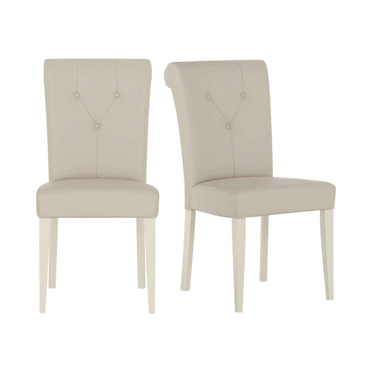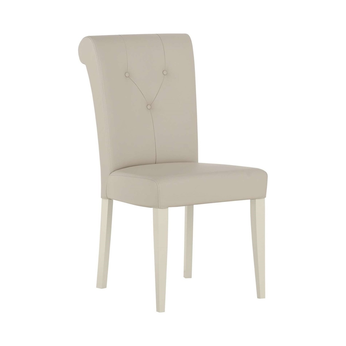 Classic style with contemporary flair, the Annecy pair of upholstered roll back dining chairs complements almost any style of dining table.;Generously cushioned and fully upholstered in soft faux leather, these chairs feature traditional roll back tops. This luxurious high-end look has a modern feel thanks to the finely tailored upholstery and simple minimal buttoning detail.;They’re made to last with solid beech frames with your choice of soft grey or antique white painted finish. Slender tapered legs add to the elegant feel.;The Annecy pair of upholstered roll back dining chairs is part of the Annecy range of living and dining room furniture and are designed to perfectly complement the Annecy dining table, available in two sizes. The Annecy narrow sideboard or the Annecy display cabinet completes your charmingly elegant dining room.