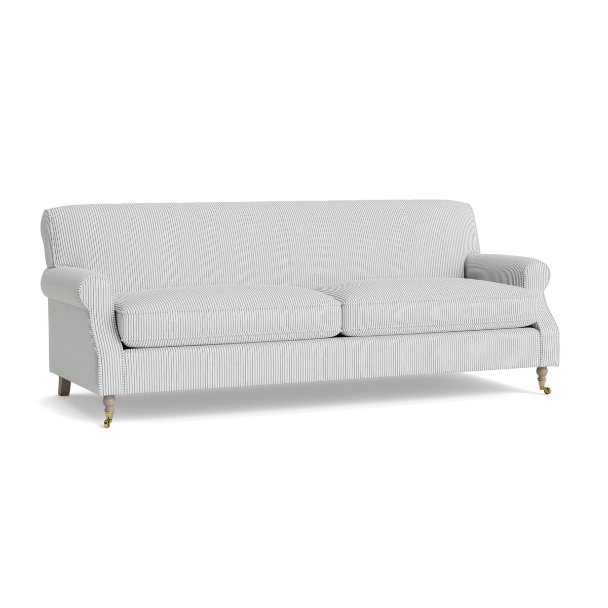 The star of our Annecy collection, the sofa is sophistication itself. A tailored back provides firm support while the base cushions have a foam and feather fill for a squishy inviting seat. P-shaped arms are neatly piped for a premium finish and turned wooden legs on castors provide an extra touch of elegance. The sofa is available as a two or three seater option and the Annecy range also includes an armchair and an ottoman. Pictured here in our blue and white stripe material, our Annecy collection can be upholstered in a choice of distinctive shades and fabrics to suit your style. Read our Upholstery FAQs View our full Upholstery Terms and Conditions