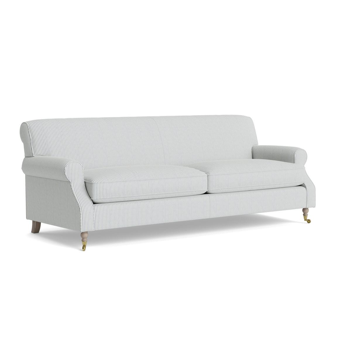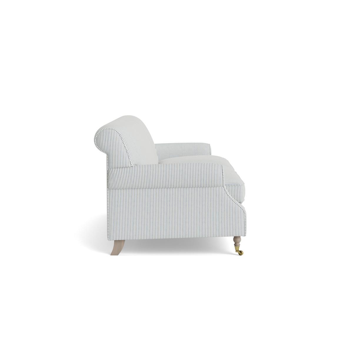 The star of our Annecy collection, the sofa is sophistication itself. A tailored back provides firm support while the base cushions have a foam and feather fill for a squishy inviting seat. P-shaped arms are neatly piped for a premium finish and turned wooden legs on castors provide an extra touch of elegance. The sofa is available as a two or three seater option and the Annecy range also includes an armchair and an ottoman. Pictured here in our blue and white stripe material, our Annecy collection can be upholstered in a choice of distinctive shades and fabrics to suit your style. Read our Upholstery FAQs View our full Upholstery Terms and Conditions