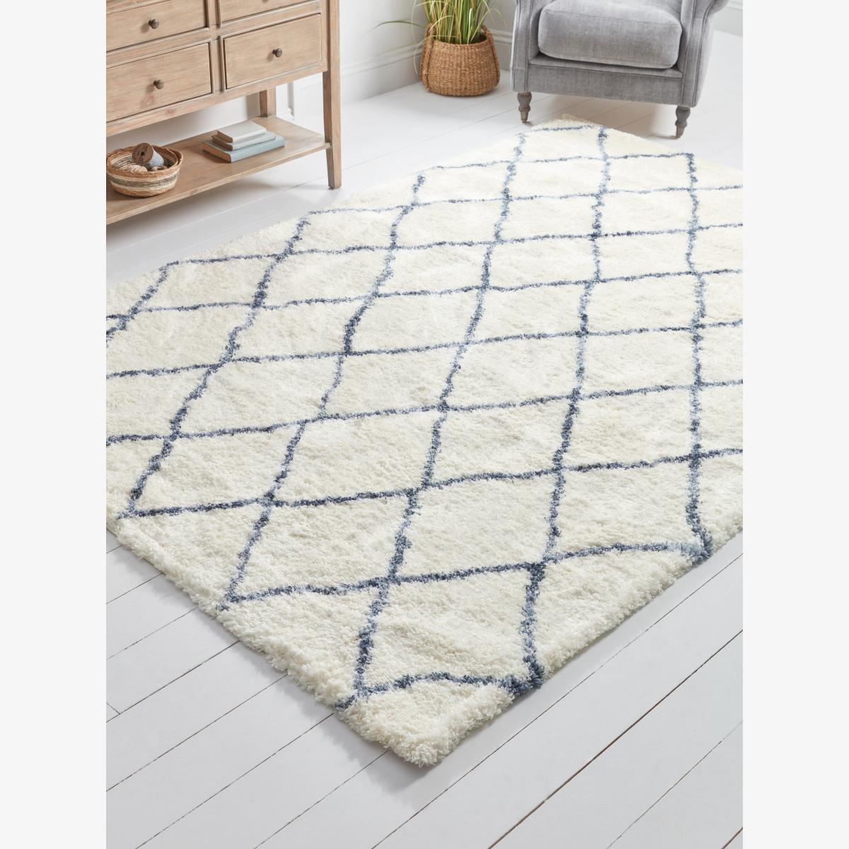 I love this one for its versatility and understated style. It works particularly well in modern or minimalist interiors, adding softness and texture without overwhelming the space. The neutral tones and simple geometric pattern make it easy to layer with other textiles and furnishings. Practical styling tips include placing it under a coffee table in the living room to anchor the seating area, or using it in a bedroom as a cosy rug beside the bed. To keep it looking fresh, opt for a rug pad to prevent slipping and occasional vacuuming to maintain its plushness. It’s a straightforward way to bring warmth and visual interest to a room without fuss.