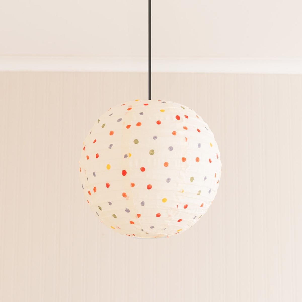 Cute, quirky and fun, this polka dot fabric lantern shade adds a playful aesthetic. Blending all things cute and quaint, the Annie polka dot fabric ball shade works well in homes with colourful and vibrant styles. The cream fabric allows a lovely, soft glow to disperse throughout the room, creating a cosy feel. A classic silhouette, this cream fabric globe lightshade has a beautiful polka dot pattern covering the whole sphere.The adorable colourful dot pattern on the fabric lantern helps it to blend seamlessly into vibrant home interiors. The Annie polka dot fabric ball shade looks great hanging from ceilings in living rooms, dining rooms, and children's bedroom.s