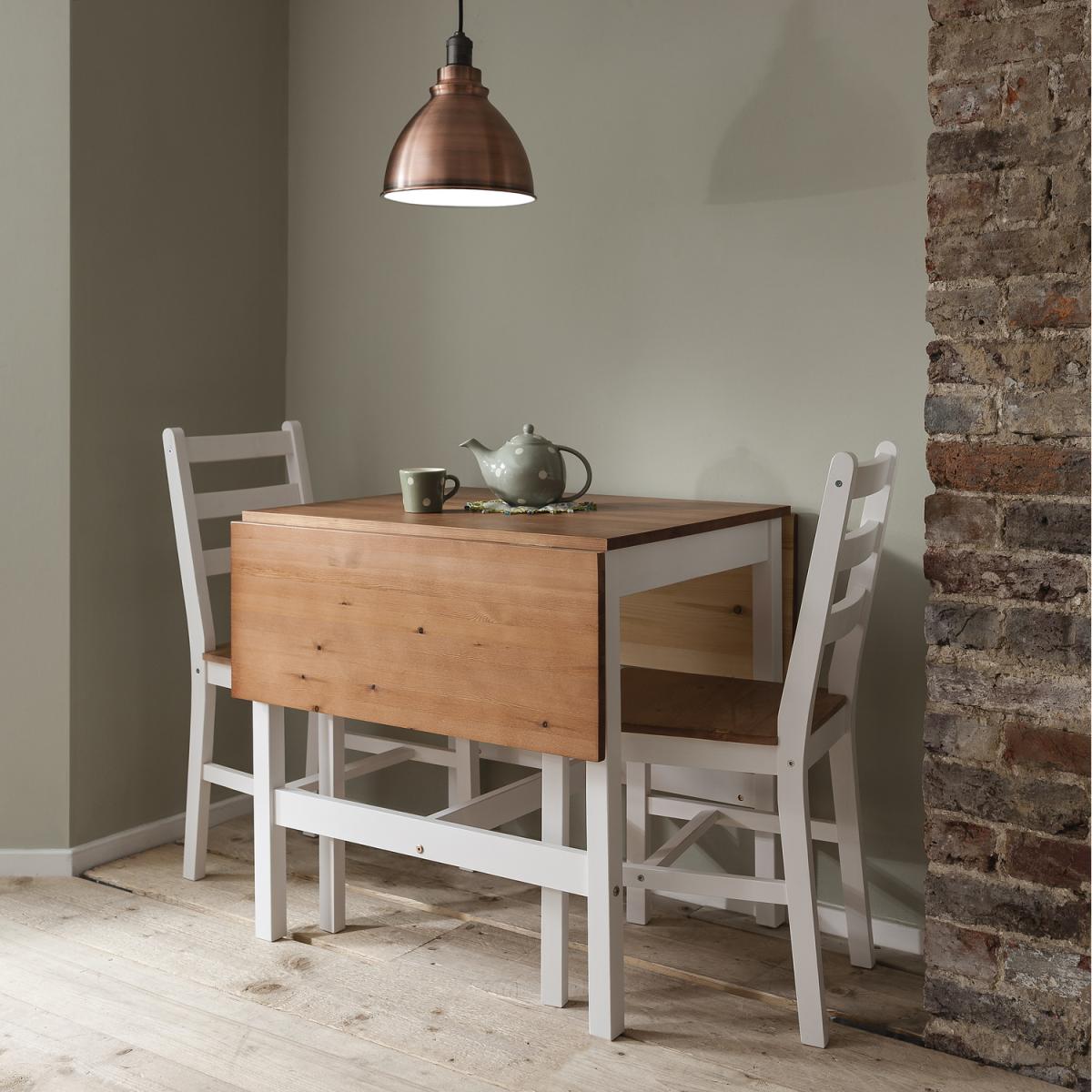 I’m a fan of this simple white-and-pine dropleaf table because it combines clean lines with practical fold-away leaves, making it ideal for both snug kitchens and open-plan living spaces. Its light tones suit Scandi, coastal or modern farmhouse schemes, and it’s easy to pair with a mix of chairs - think painted wooden or minimalist metal frames for contrast. For styling, keep the tabletop clutter-free: a slim linen runner, a small plant or a pair of candlesticks makes an elegant centrepiece without overwhelming the surface. When not in use, drop one leaf and lean the table against a wall as a console or sofa table, then tuck a couple of stools underneath to save space.