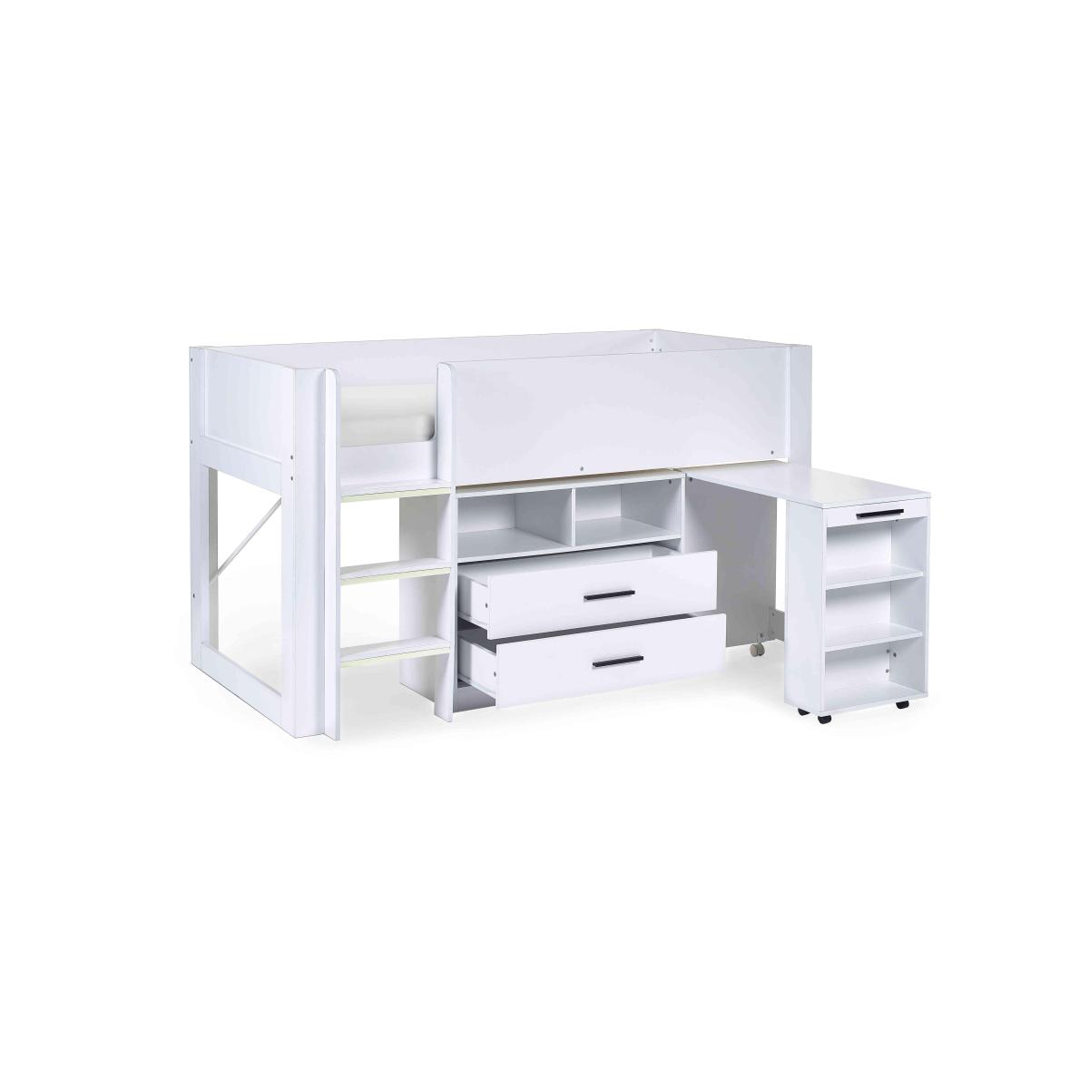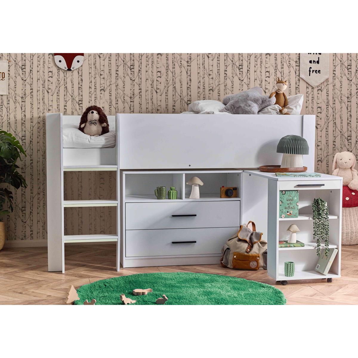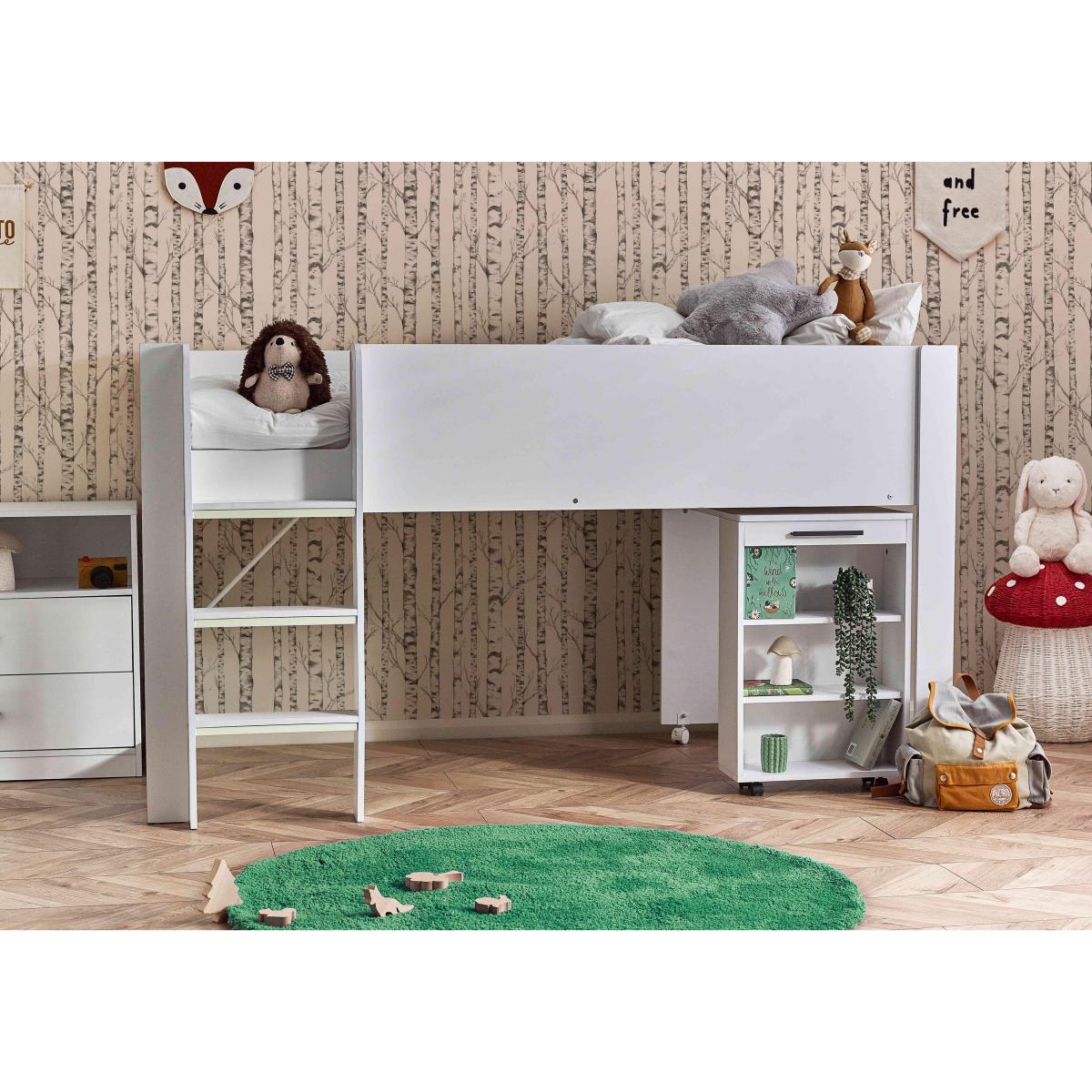 It’s a bed, a work zone and a storage unit – this ingenious and space-efficient mid-sleeper bed with pull-out desk is designed to charm parents and children alike. Why you'll love it This clever mid-sleeper bed is packed with features that appeal to parents and children. Pull-out desk on wheels with shelving slides under the bed when not in use. Roomy storage unit has shelves and 2 drawers. Integrated ladder has glow-in-the-dark steps for safety. Choose bright all-white or urban wood-effect and black finish. This mid-sleeper with desk is part of our children’s bedroom furniture collection. What you need to know Mattress not included. Delivered to you flat-packed. Assembly required. Suitable for children aged 6 and over. Requires a standard UK single mattress (90 cm x 190 cm). For safety reasons, mattress should be no more than 18 cm deep. Takes 2 people approximately 120 minutes to assemble. A clearance of 10 cm at either end of this bed is required for assembly. WARNING!
