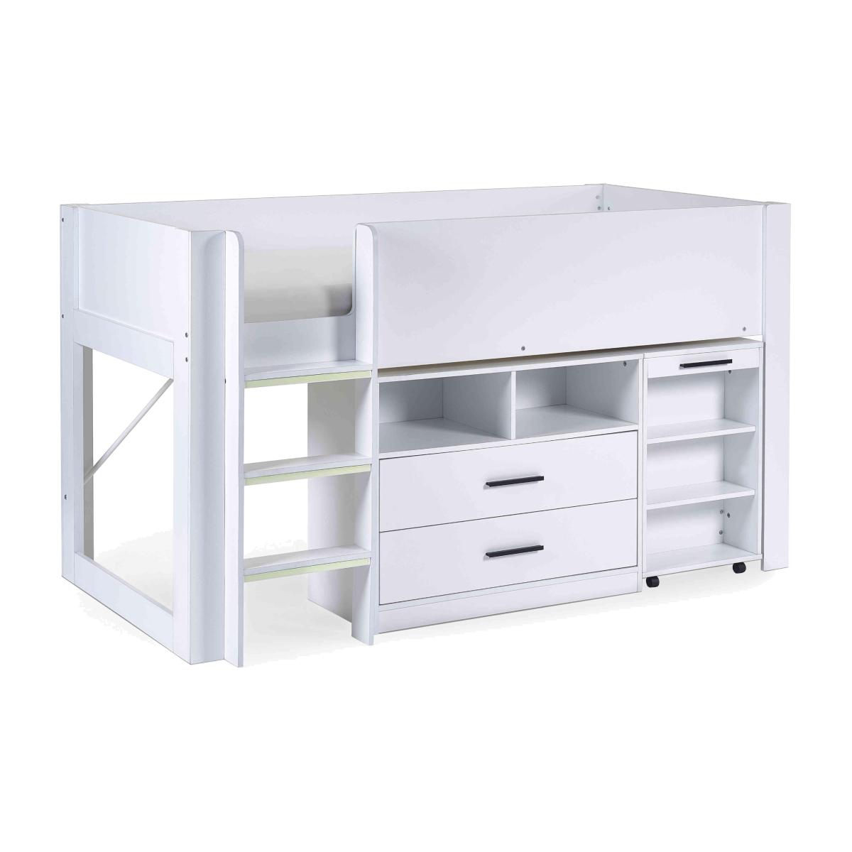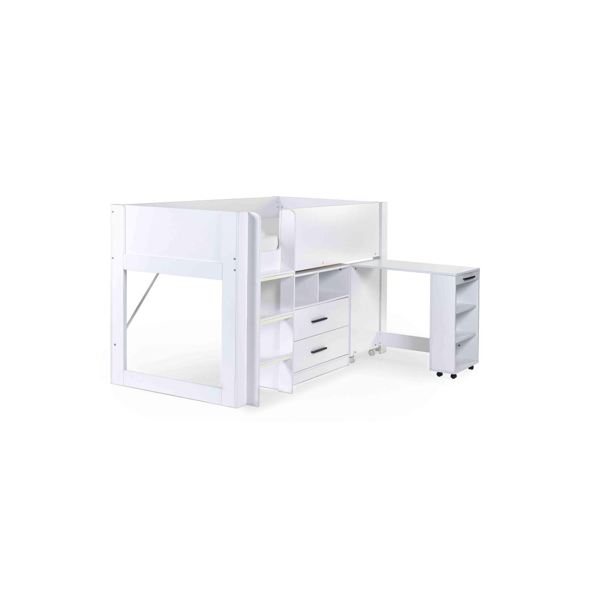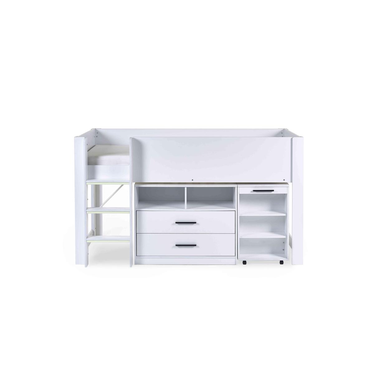 It’s a bed, a work zone and a storage unit – this ingenious and space-efficient mid-sleeper bed with pull-out desk is designed to charm parents and children alike. Why you'll love it This clever mid-sleeper bed is packed with features that appeal to parents and children. Pull-out desk on wheels with shelving slides under the bed when not in use. Roomy storage unit has shelves and 2 drawers. Integrated ladder has glow-in-the-dark steps for safety. Choose bright all-white or urban wood-effect and black finish. This mid-sleeper with desk is part of our children’s bedroom furniture collection. What you need to know Mattress not included. Delivered to you flat-packed. Assembly required. Suitable for children aged 6 and over. Requires a standard UK single mattress (90 cm x 190 cm). For safety reasons, mattress should be no more than 18 cm deep. Takes 2 people approximately 120 minutes to assemble. A clearance of 10 cm at either end of this bed is required for assembly. WARNING!