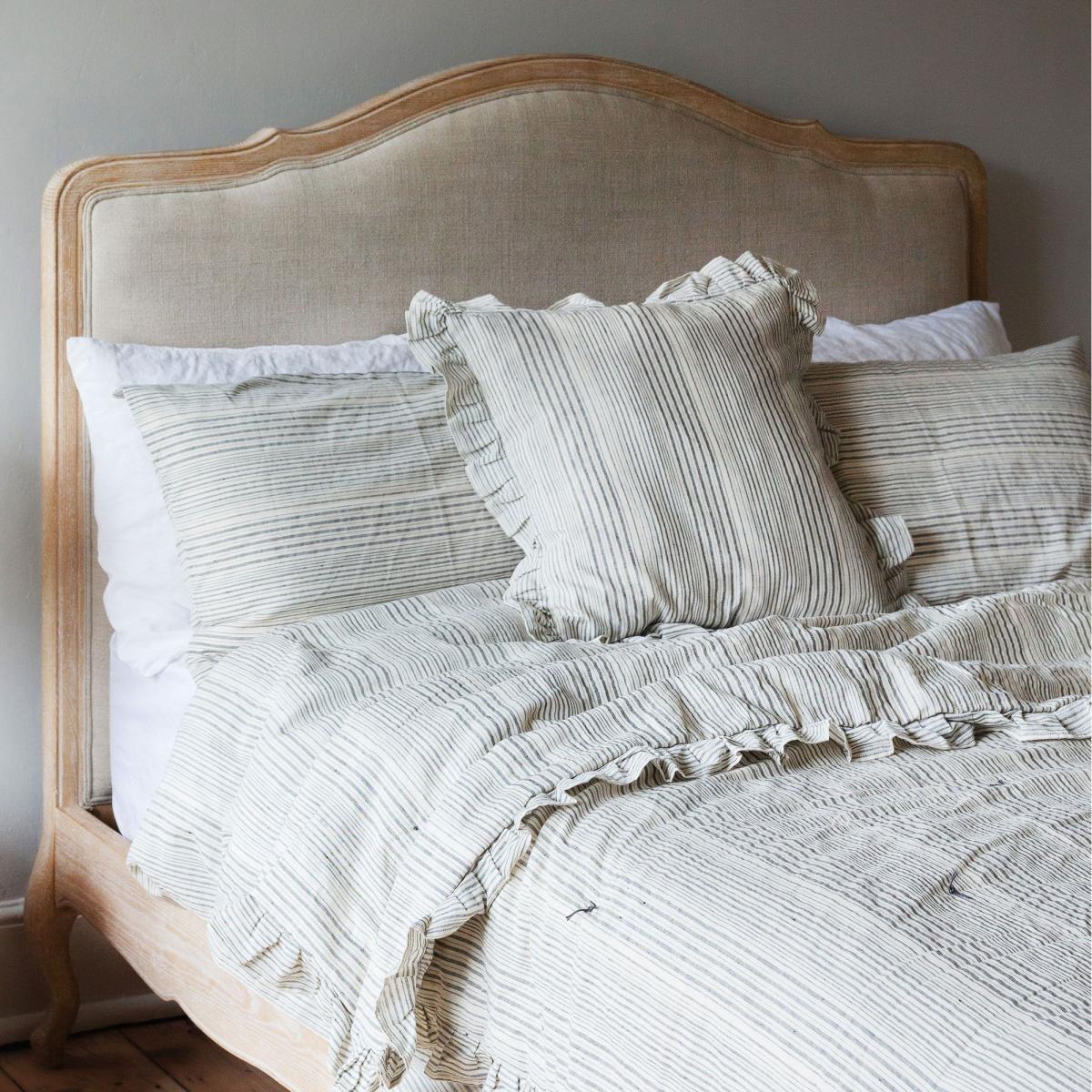 With a flourish of French farmhouse style, this plump cotton and linen cushion features a romantic frilled edge and a classic stripe pattern.
