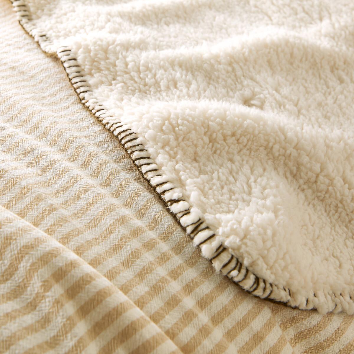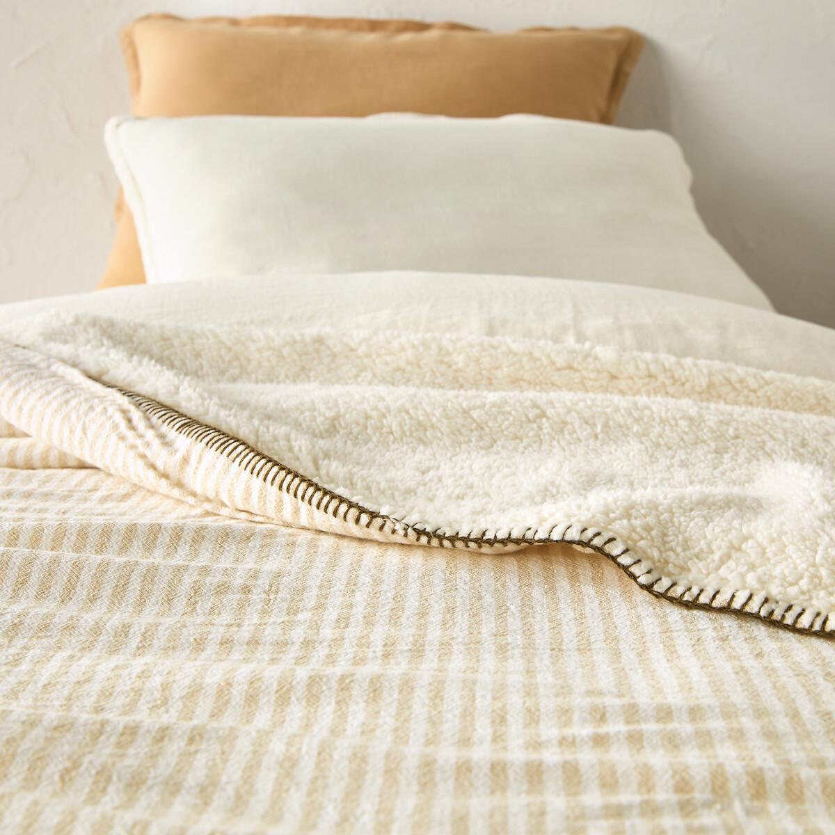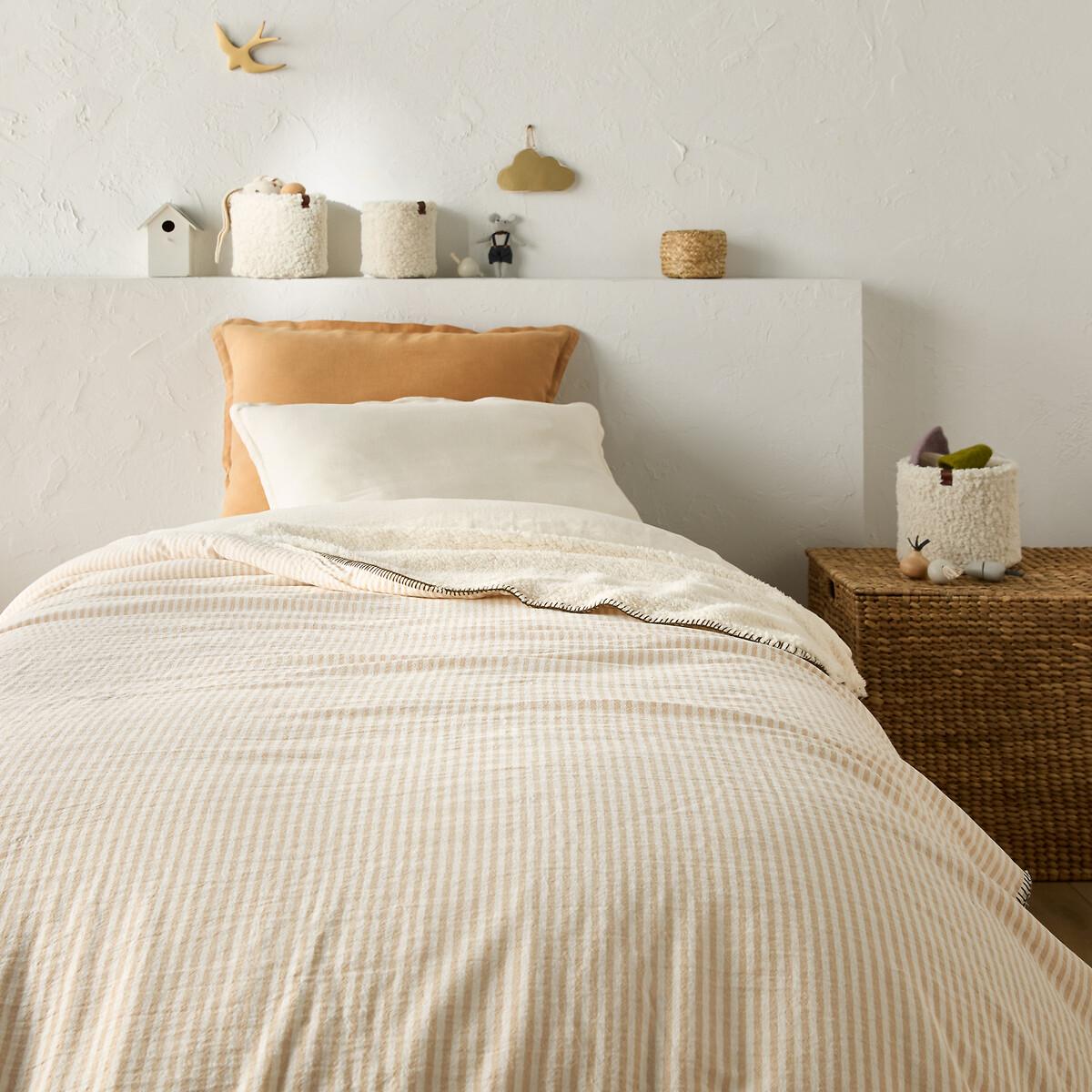 Cosy, warm and soft... The Anoti bedspread is made up of one side in woven-dyed cotton with fine stripes and one side in faux fleece. Placed on a bed, it will create a cosy feel in your child's bedroom. Product Details • Front: 100% cotton dyed woven pinstripe • Back: 100% polyester • Contrasting overlapping stitched trim. Care Advice • Machine washable at: 30°CDimensions • 140 x 200cm • OEKO-TEX® Standard 100. Standard 100 certification by OEKO-TEX® tests textile products for harmful substances via an independent, international label.
