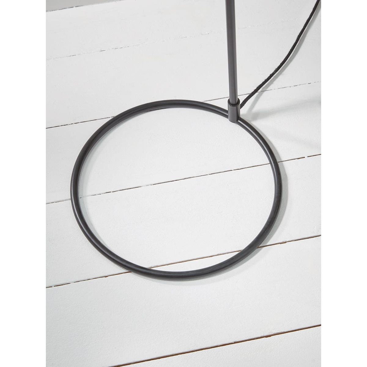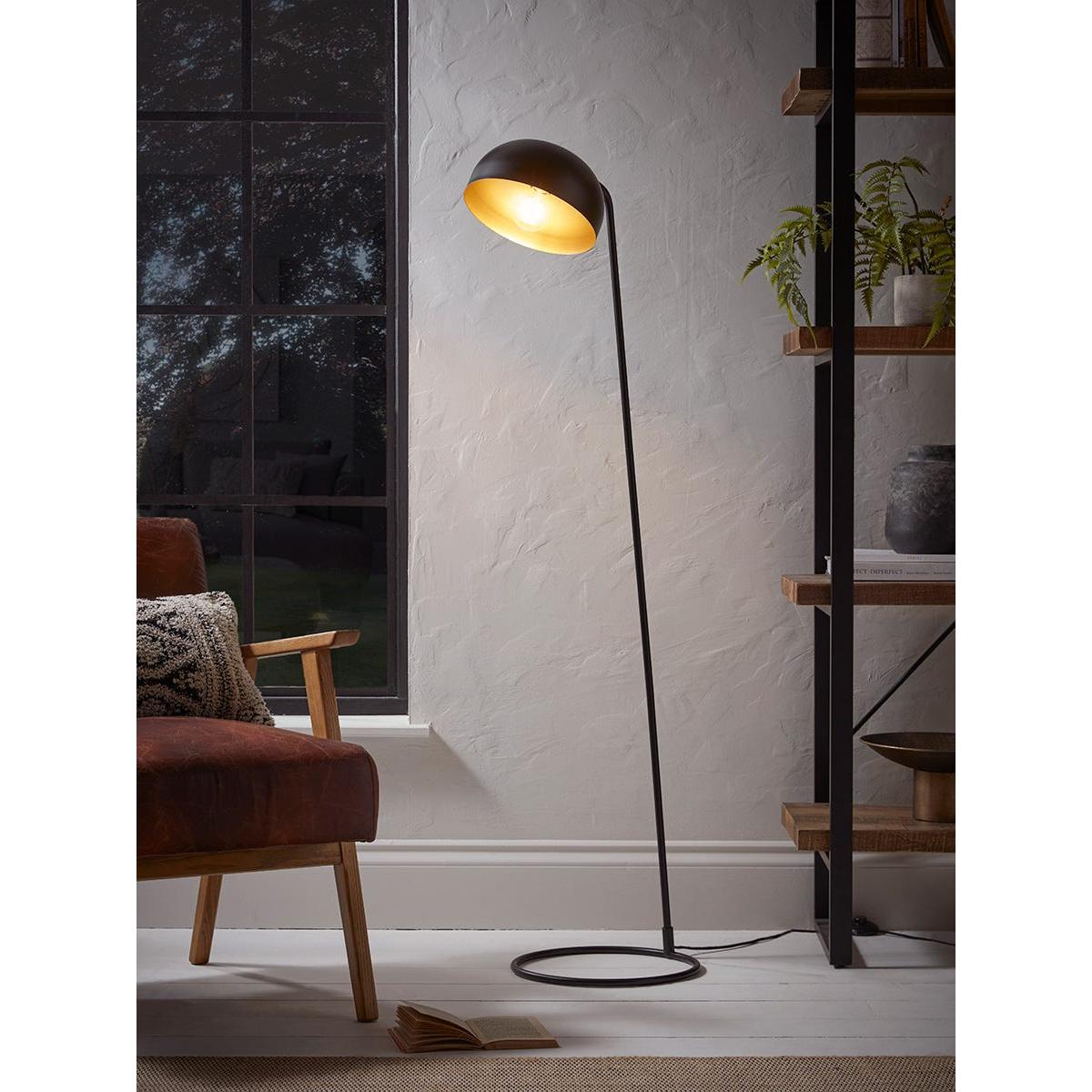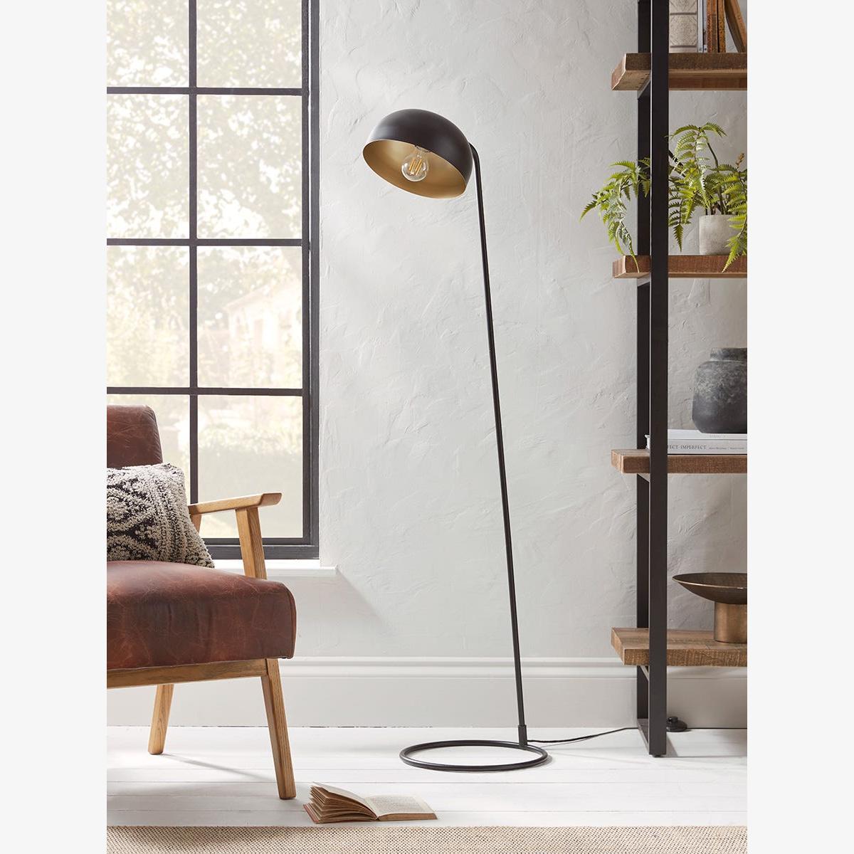 The classic industrial styling of this floor lamp is elevated by the contemporary matte black finish and luxurious brass painted finish inside of the shade. Supported on a slender stem which rises from a hooped base, the head can be adjusted to focus the light more directly.