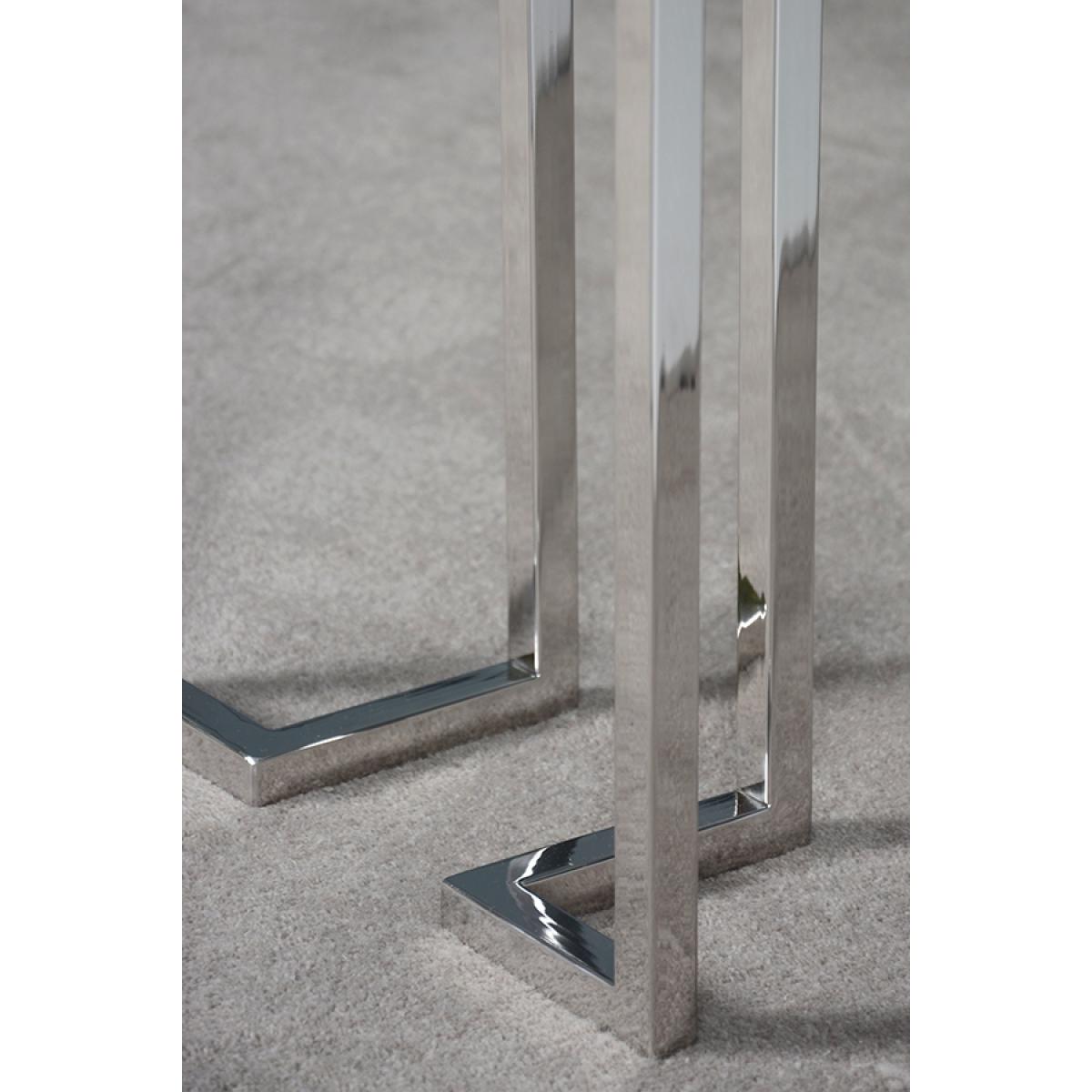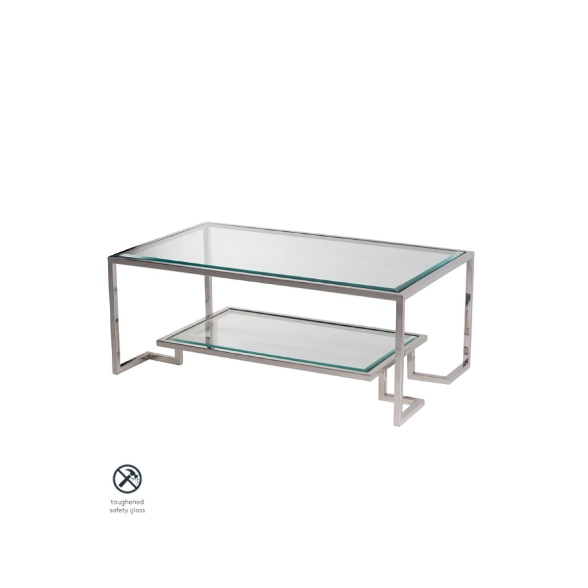 A handsome, sculptural coffee table inspired by classical Greek architecture. The distinctive geometric shape incorporates an integral shelf for display and additional storage. Tubular steel construction with mirror polished chrome finish. Toughened glass surfaces. Supplied fully assembled.