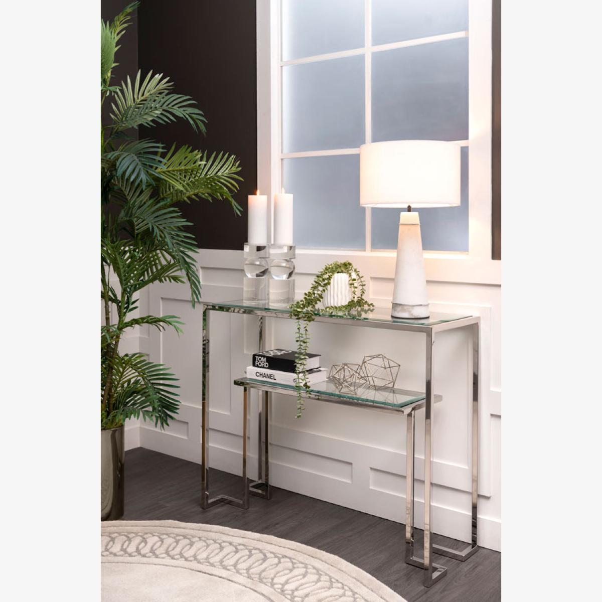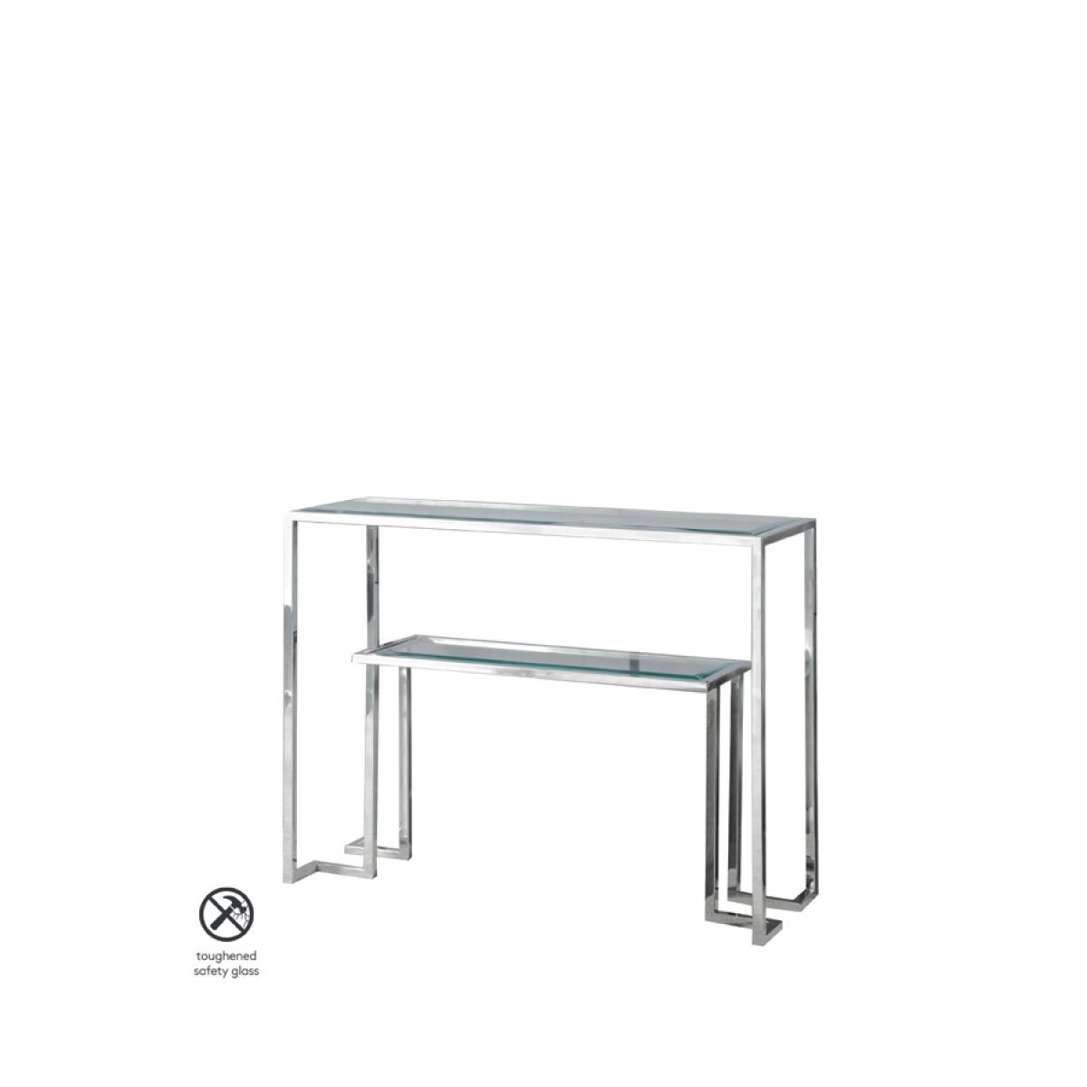 A handsome, sculptural console table inspired by classical Greek architecture. The distinctive geometric shape incorporates an integral shelf for display and additional storage. Tubular steel construction with mirror polished chrome finish. Toughened glass surfaces. Supplied fully assembled.
