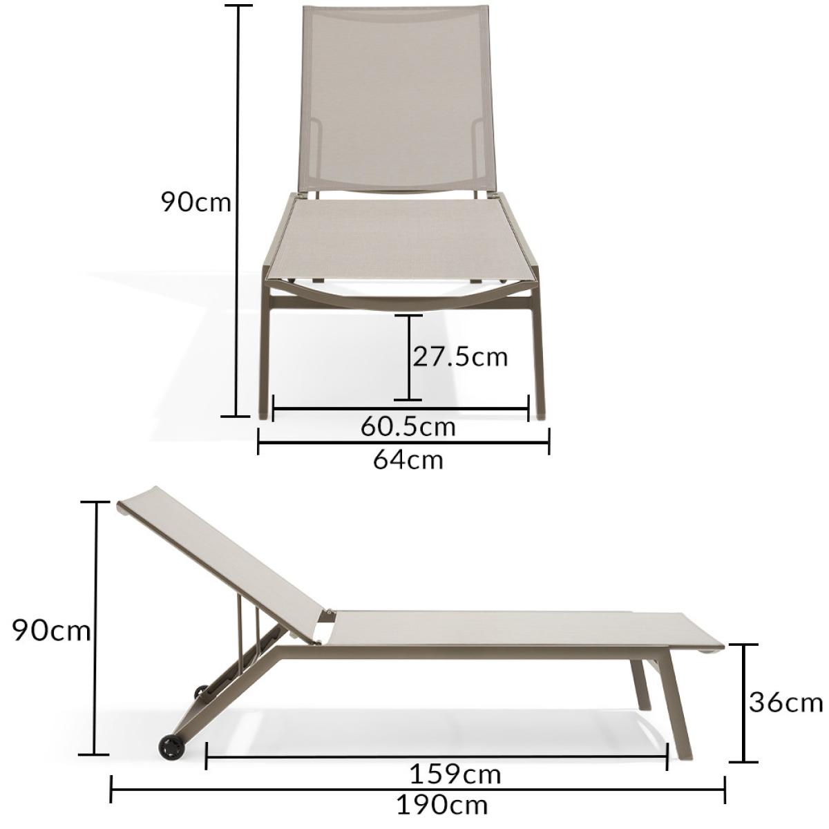 Create your little oasis to worship the sun with the Anthurium Champagne Garden Lounger. Unassuming yet impressively comfortable, they are perfect for relaxing on your balcony, by the pool or in the garden. Sturdy champagne coloured powder-coated aluminium frame. Durable yet comfy fabric for leisurely lounging. Hard-wearing textylene fabric (30% polyester + 70% PVC)Complements the entire Anthurium garden collection. Choose from sophisticated champagne or on-trend grey