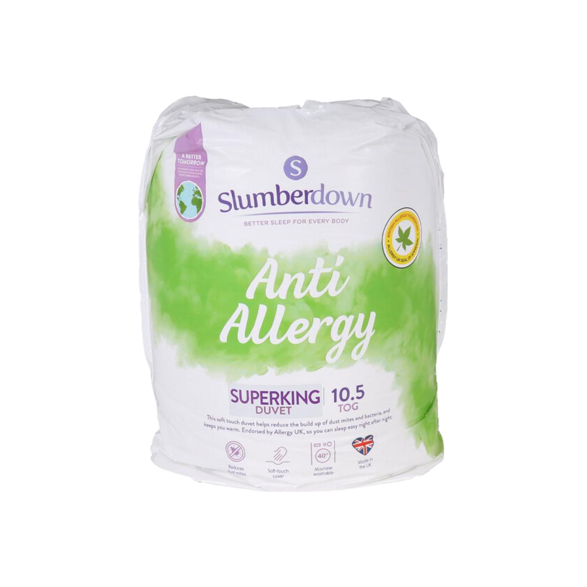 The Slumberdown Anti-Allergy 10.5 Tog Duvet inhibits dust mites, bacteria and fungus, providing you with peace of mind that there's no nasties lurking around your bed! An absolute must for those who suffer from allergies, this duvet is made with a soft 100% recycled polyester hollowfibre filling and a luxury microfibre cover. This cosy and sustainable 10.5 tog duvet is ideal for use all year round, and can even be machine washed and tumble dryer for ease of care.
