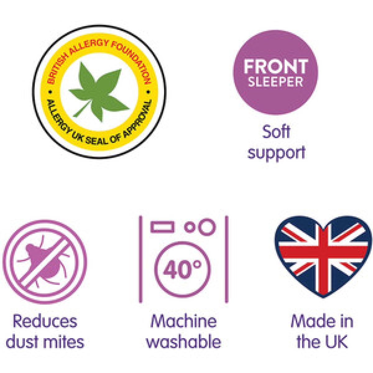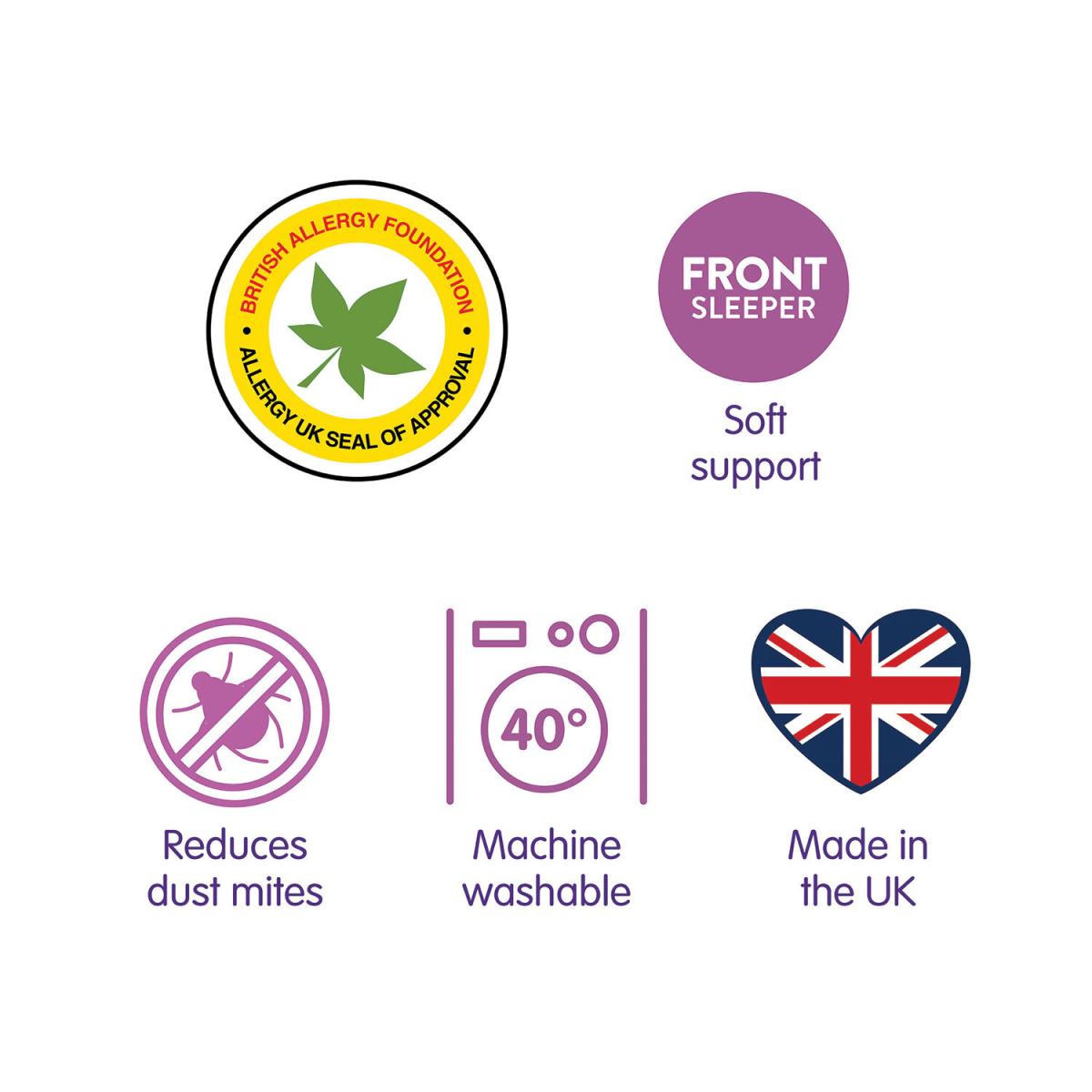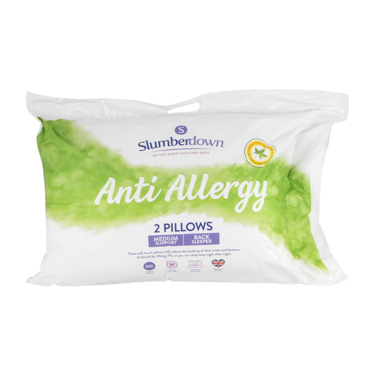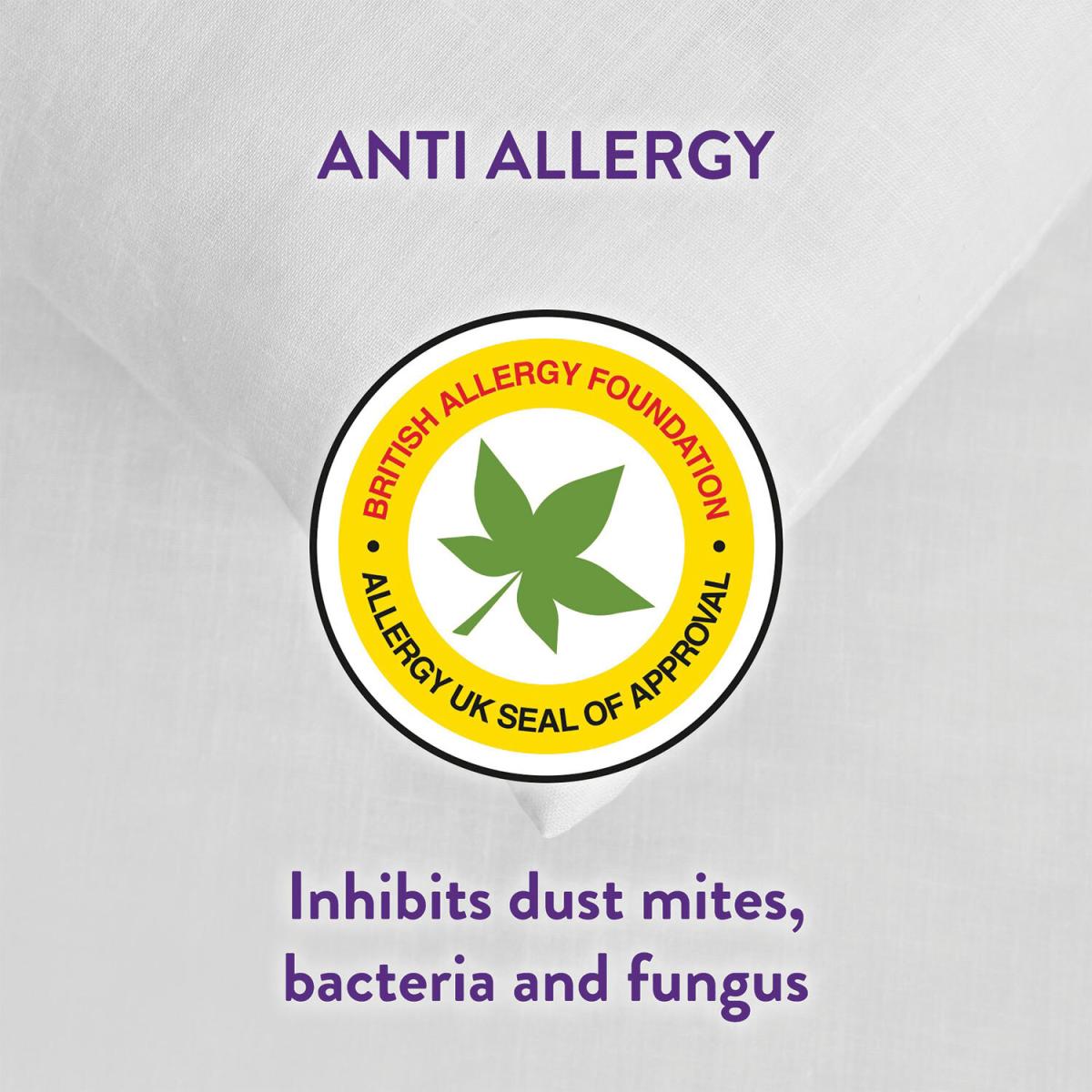 For a peaceful night's sleep free look no further than this sustainable Anti Allergy Pillow Pair. These pillows inhibit dustmites, bacteria and fungus so they're a must have for allergy sufferers. The soft 100% recycled polyester hollowfibre filling and luxurious microfibre cover offers medium support, ideal for back sleepers. All Slumberdown Anti Allergy products come with Allergy UK's Seal of Approval.