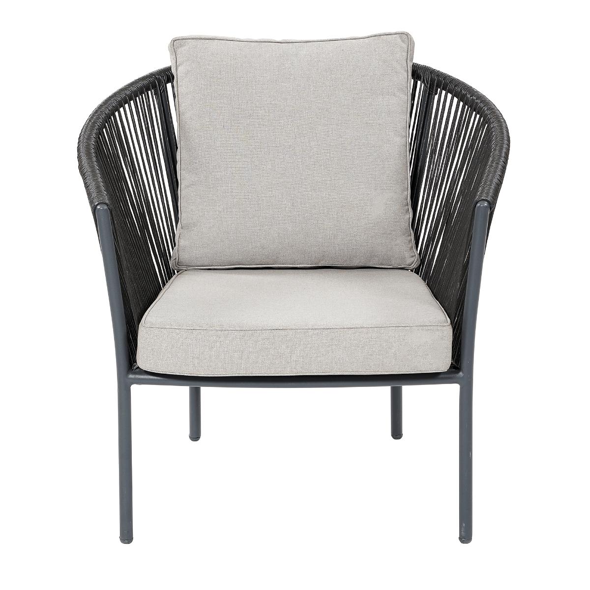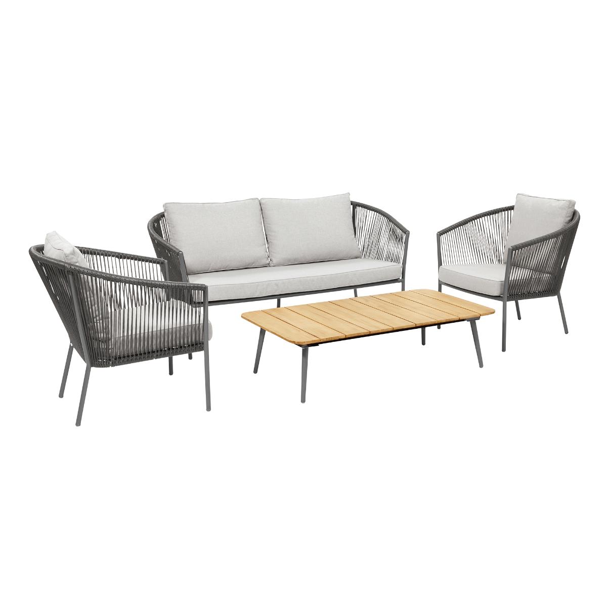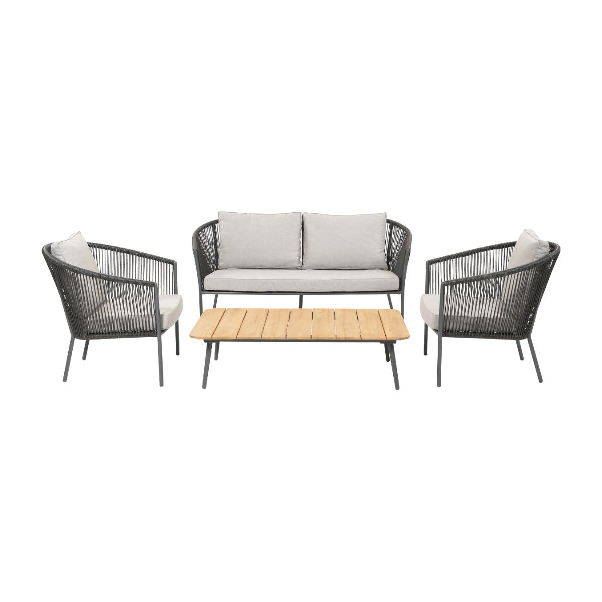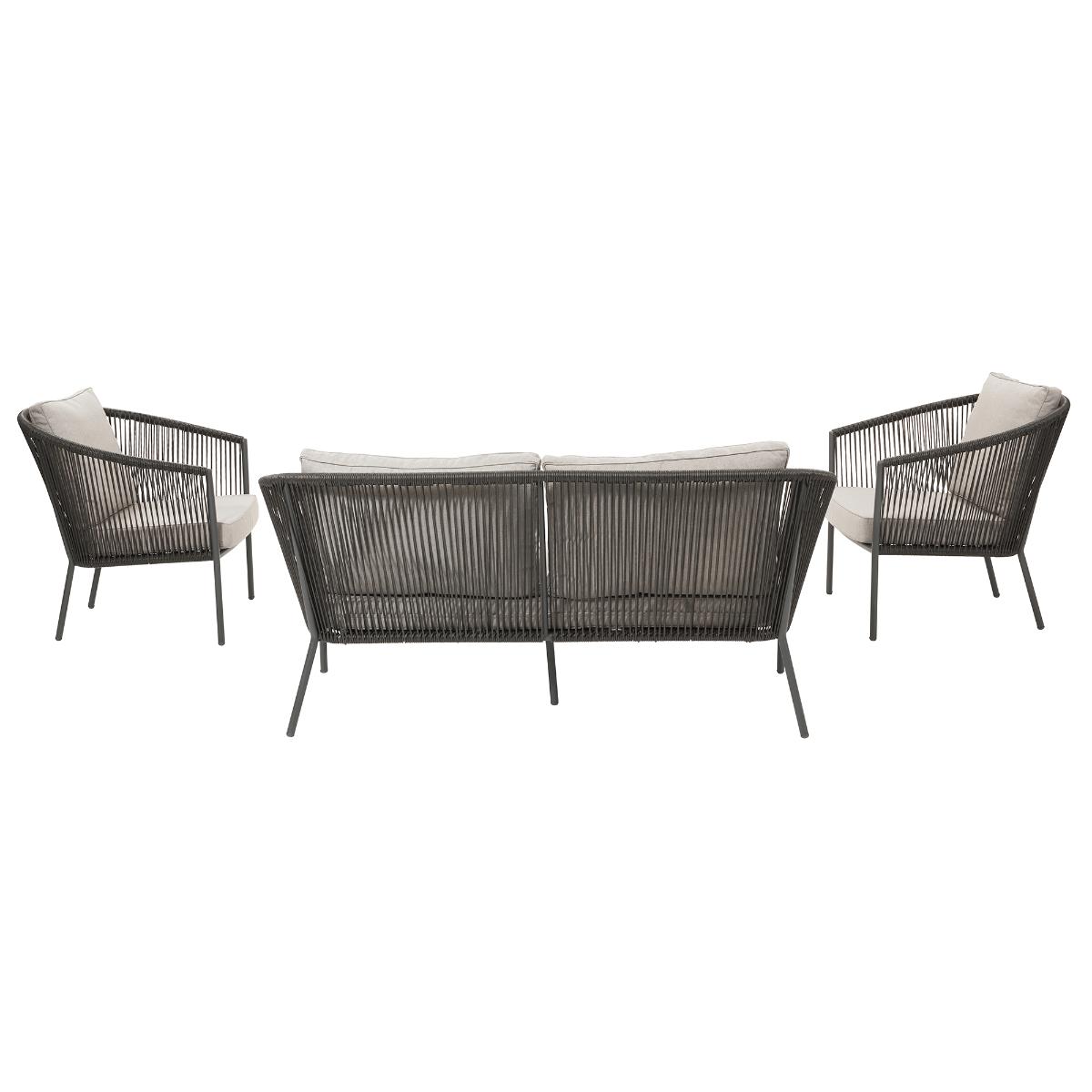 Design. The Antigua Garden Lounge Set comprises of a sofa, two chairs and a coffee table, made from durable and weatherproof materials to ensure garden entertaining for years to come. The stylish twisted polystring back and sides to the sofa and chairs oozes ultra-modern sophistication, adorned with grey cushions to provide the ultimate space of comfort.