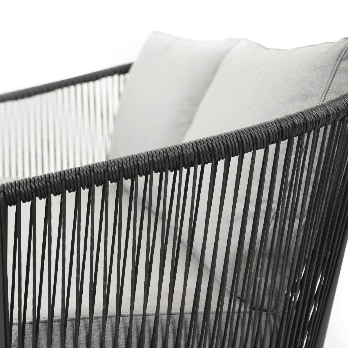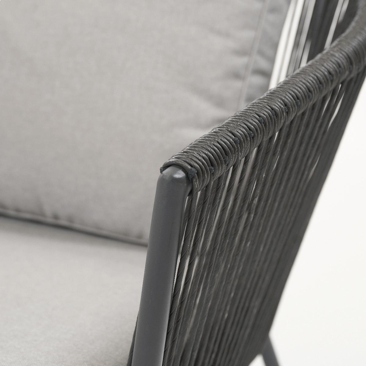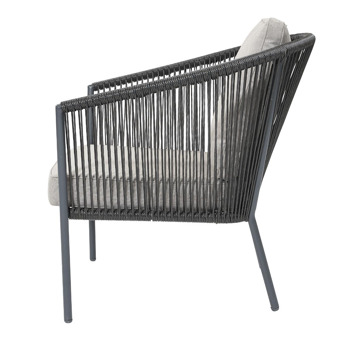 Design. The Antigua Garden Lounge Set comprises of a sofa, two chairs and a coffee table, made from durable and weatherproof materials to ensure garden entertaining for years to come. The stylish twisted polystring back and sides to the sofa and chairs oozes ultra-modern sophistication, adorned with grey cushions to provide the ultimate space of comfort.