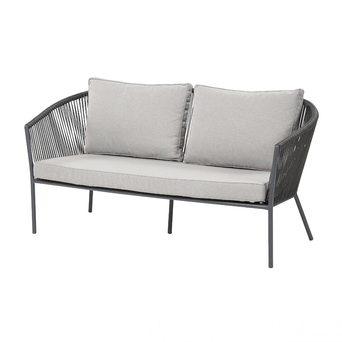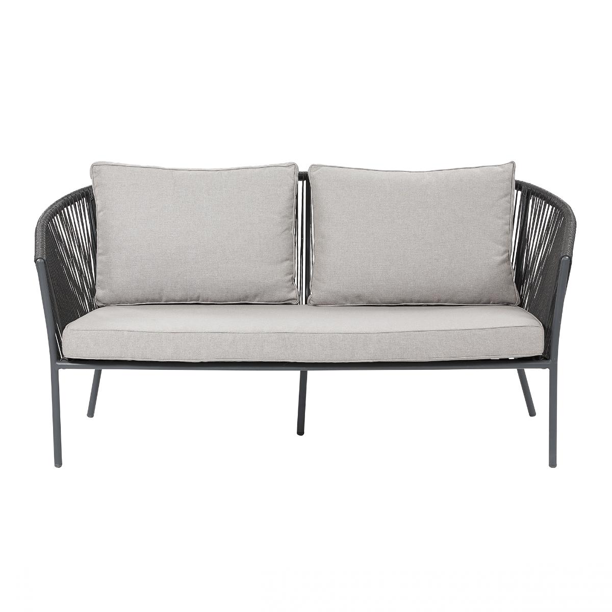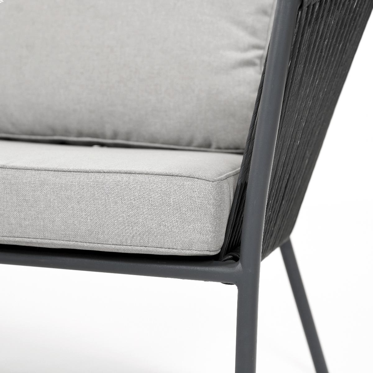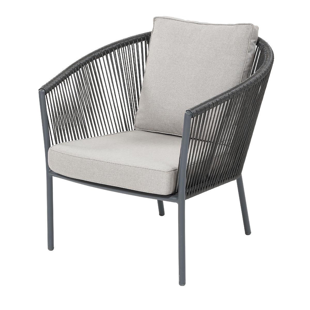 Design. The Antigua Garden Lounge Set comprises of a sofa, two chairs and a coffee table, made from durable and weatherproof materials to ensure garden entertaining for years to come. The stylish twisted polystring back and sides to the sofa and chairs oozes ultra-modern sophistication, adorned with grey cushions to provide the ultimate space of comfort.