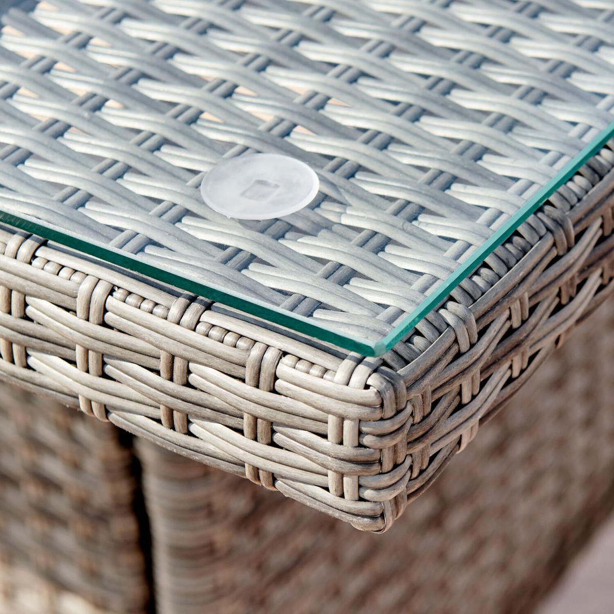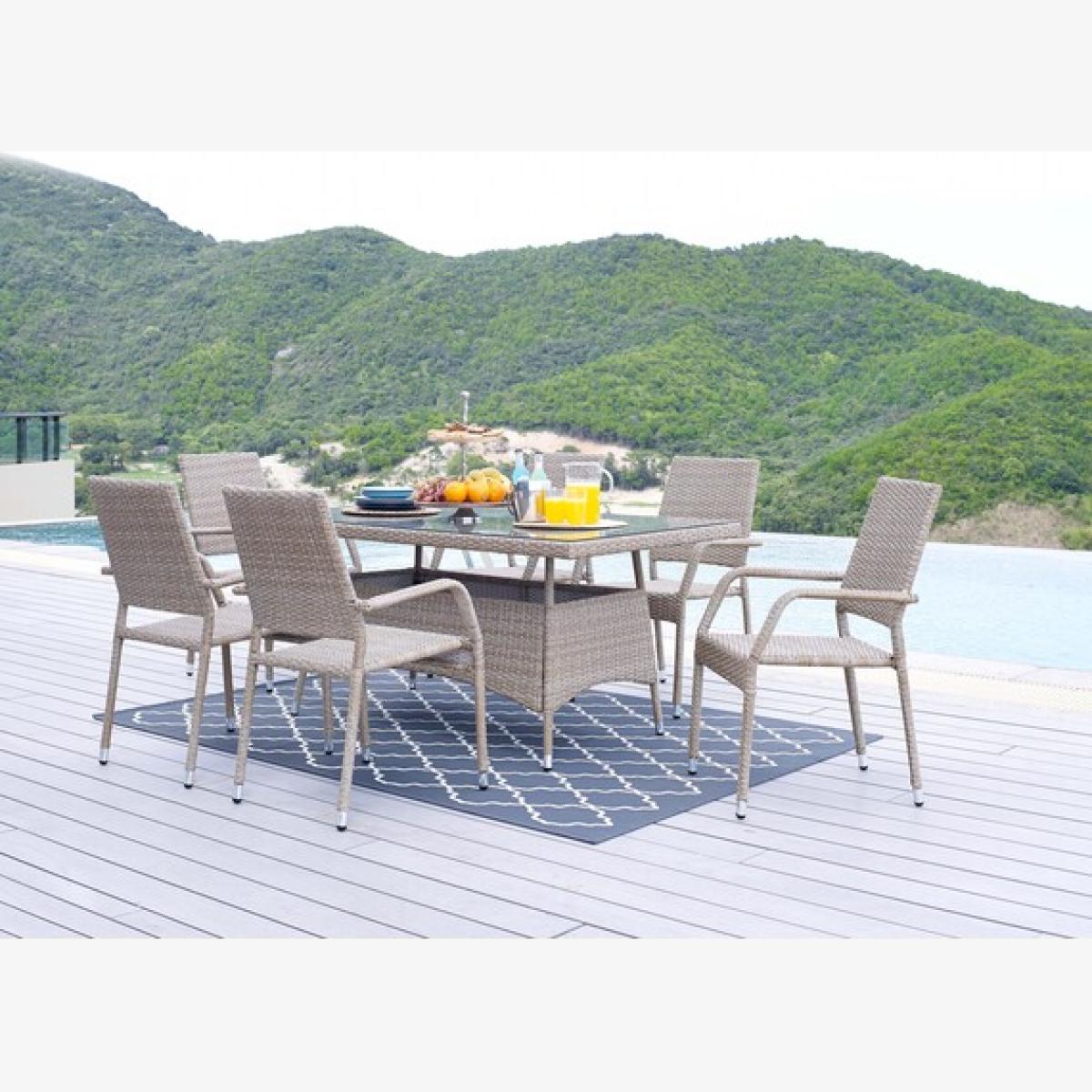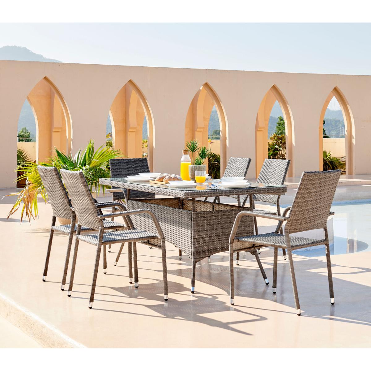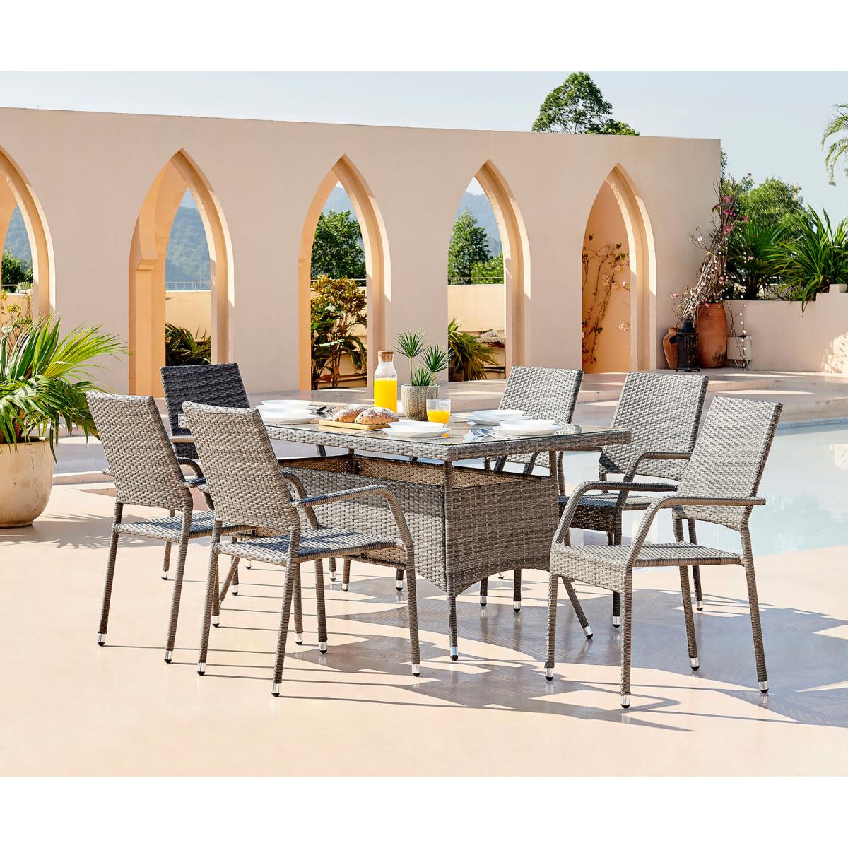 Our Antigua 6 Seat Outdoor Rattan Dining Set is a stunning modern garden dining table with glass top and 6 chairs. This is going to look great on lawns, patios and conservatories, with plenty of room for entertaining guests. The Antigua effortlessly straddles both modern minimalist and more rustic traditional styles so will look great whatever your home and outdoor decor! A stripped back, simple design of straight lines and a few statement curves. The PE rattan is stylishly woven over sturdy but lightweight steel frame. The feet of the table and chairs are polished steel. The table top is tempered 5mm thick glass, making the table light, bright and easy to keep clean. The perfect 6 seat garden table and chairs for all your outdoor living needs, whether that's fun family afternoons in the sun, or cosy chats by the firepit with friends. The PE rattan is UV and weather resistant so shouldn't fade. This set includes a FREE water resistant cover but please note, this is not fully waterproof. We're excited to bring you our new outdoor range developed in-house by our product design team! We've overseen the process, from creating initial designs to hand-selecting the colours and fabrics. So, you can rest assured that you'll receive a Furniturebox design that won't compromise on style or comfort and won't break the bank!