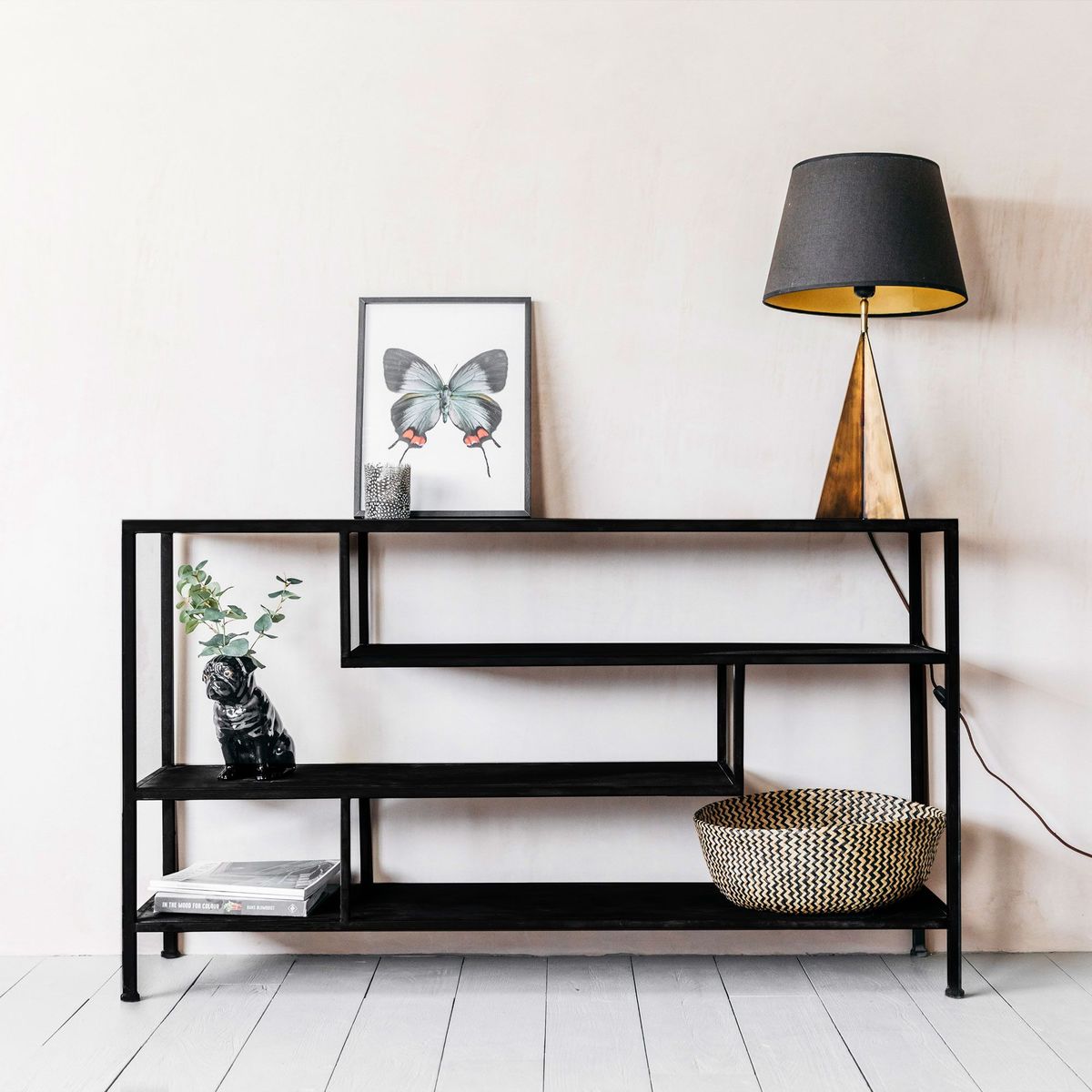 Geometric form gives this black console with shelves a modern edge. Featuring Mondrian-esque lines, this contemporary console is a functional and covetable shelving solution. Three asymmetric, spacious shelves provide the perfect solution for storing books and decorative home accessories. Features an antiqued, lightly distressed black painted finish.;Psst, click here to download our handy guide to check if your new furniture will fit correctly into your space before you order.
