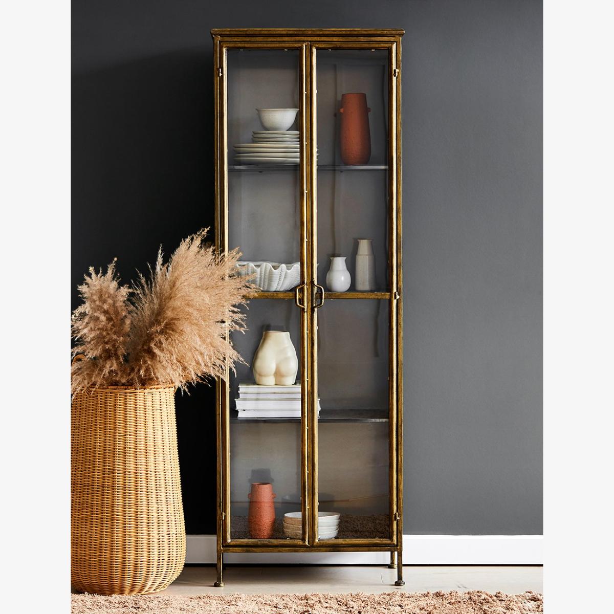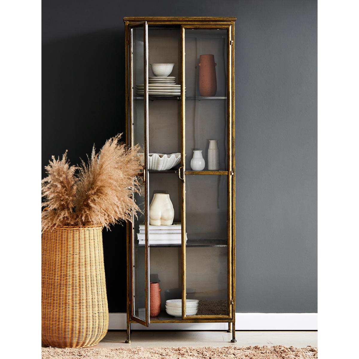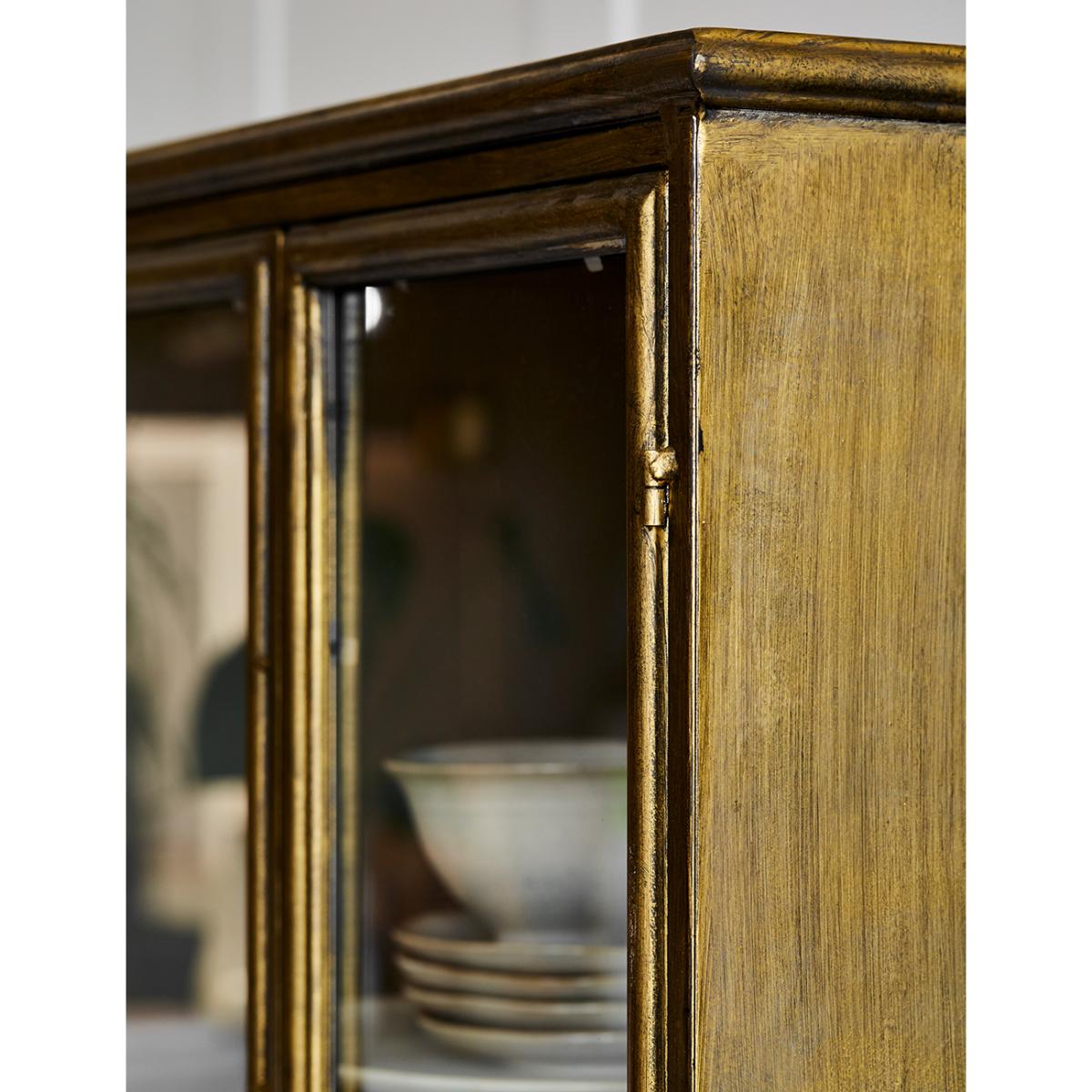 This beautifully crafted antique brass and glass display cabinet is perfect for showing off your favourite glassware or a curated collection of vases and books in a reception room. We love the vintage appeal of this cabinet, helping to create a timeless piece of furniture. The front and sides of the cabinet have a distressed, painted antique brass finish while the back is unfinished as the cabinet is designed to be placed against a wall.
