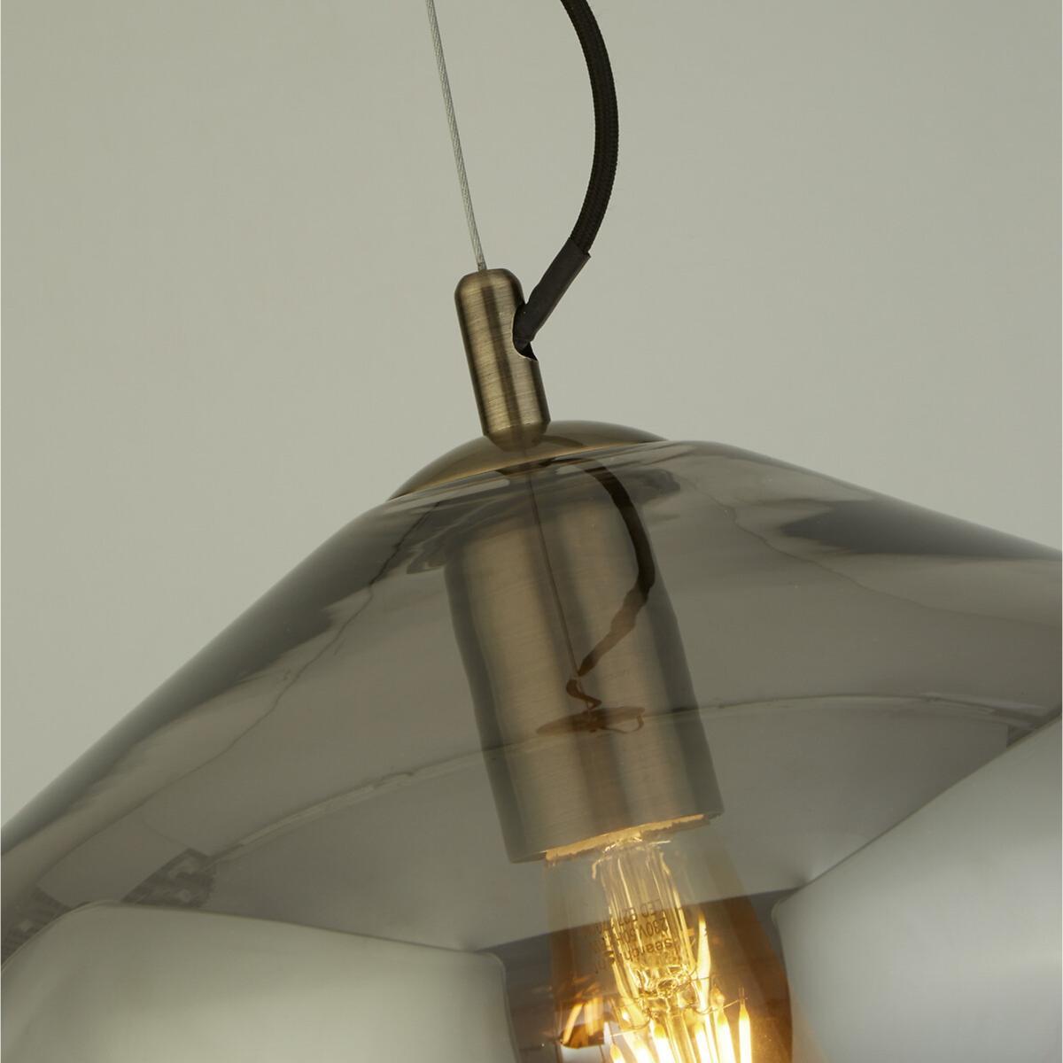 I love this pendant for its mix of vintage charm and contemporary appeal. The antique brass finish adds warmth and character, while the smoked glass shade offers a soft, diffused glow-perfect for creating cosy atmospheres. It's versatile enough to work well in kitchens, dining areas, or even a relaxed living space, especially in interiors embracing industrial, retro, or eclectic styles. When styling, consider pairing it with filament bulbs to emphasise its vintage vibe, and hang it at a height that balances well with surrounding furniture. For a cohesive look, it stacks beautifully with other brass or black fixtures, making it a great statement piece or part of a layered lighting scheme.