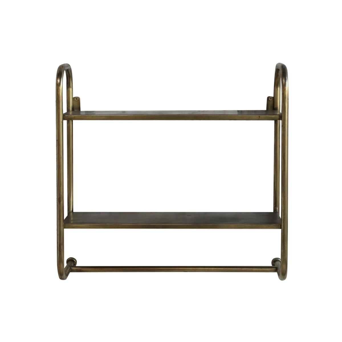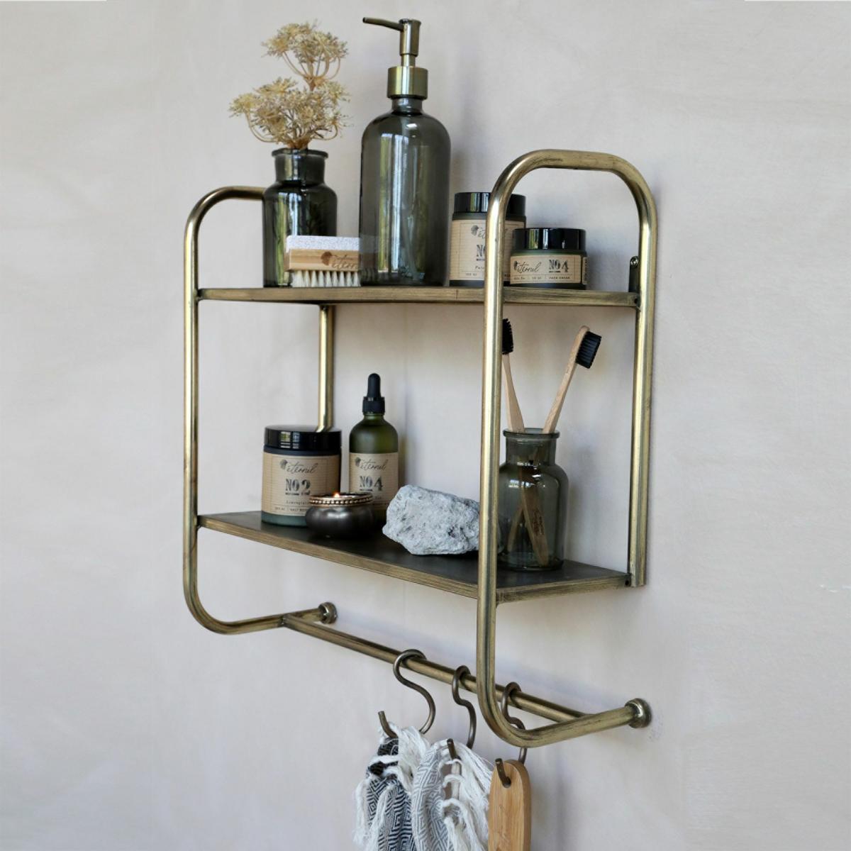 Keep all of your beauty favourites organised with a bathroom shelving unit crafted from iron with a classic antique brass finish and featuring a handy rail.