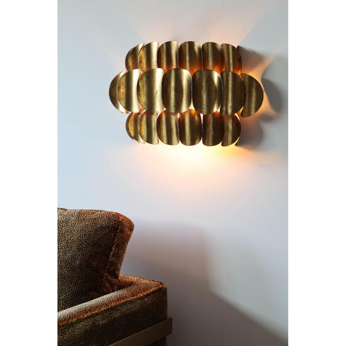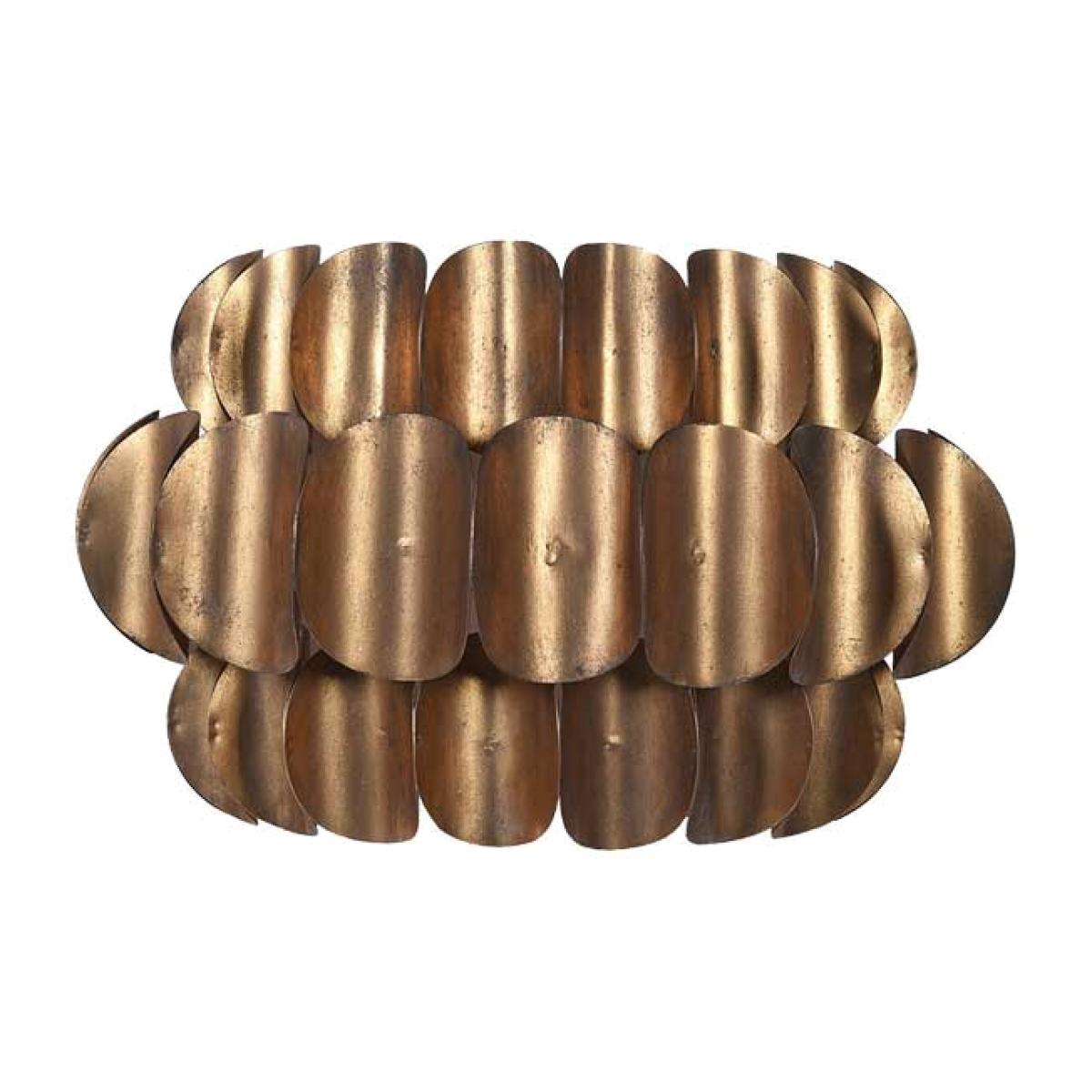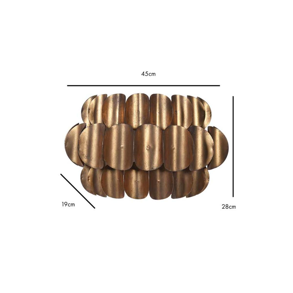 About The Antique Brass Curve Disc Wall Light Bold and beautiful, the Antique Brass Curve Disc Wall Light is statement lighting at its best! Designed with an antique brass finish on the iron base, the design reveals three rows of curved metal discs joined together to create a fabulous wall feature. Measuring H28cm x W45cm x D19cm, this light requires a B22 max 40-WATT IP20 bulb. Why We Think You’ll Love The Distressed Gold Curved Wall Light One of Jane & Lucy’s top tips for any space is to think about accent lighting. While overhead ceiling lights are great, it is wall lights and table lamps that are the key to creating a warm and inviting atmosphere in your living spaces. Pairing a bold curved design with a distressed brass finish, the curve disc indoor wall light is a wonderful example of the power of accent lighting and will even rival the chandelier as the hero lighting design in your home! How To Style The Antique Brass Indoor Wall Light The Antique Brass Curve Disc Wall Light promises instant impact wherever you choose to install it in your home. One of our favourite spots for the design is in the bedroom to create an oversized bedroom wall light with all the glamour of a boutique hotel. Alternatively, you could style a pair of the antique gold wall light on either side of the sofa for cosy mood lighting that celebrates the joy of staying in.