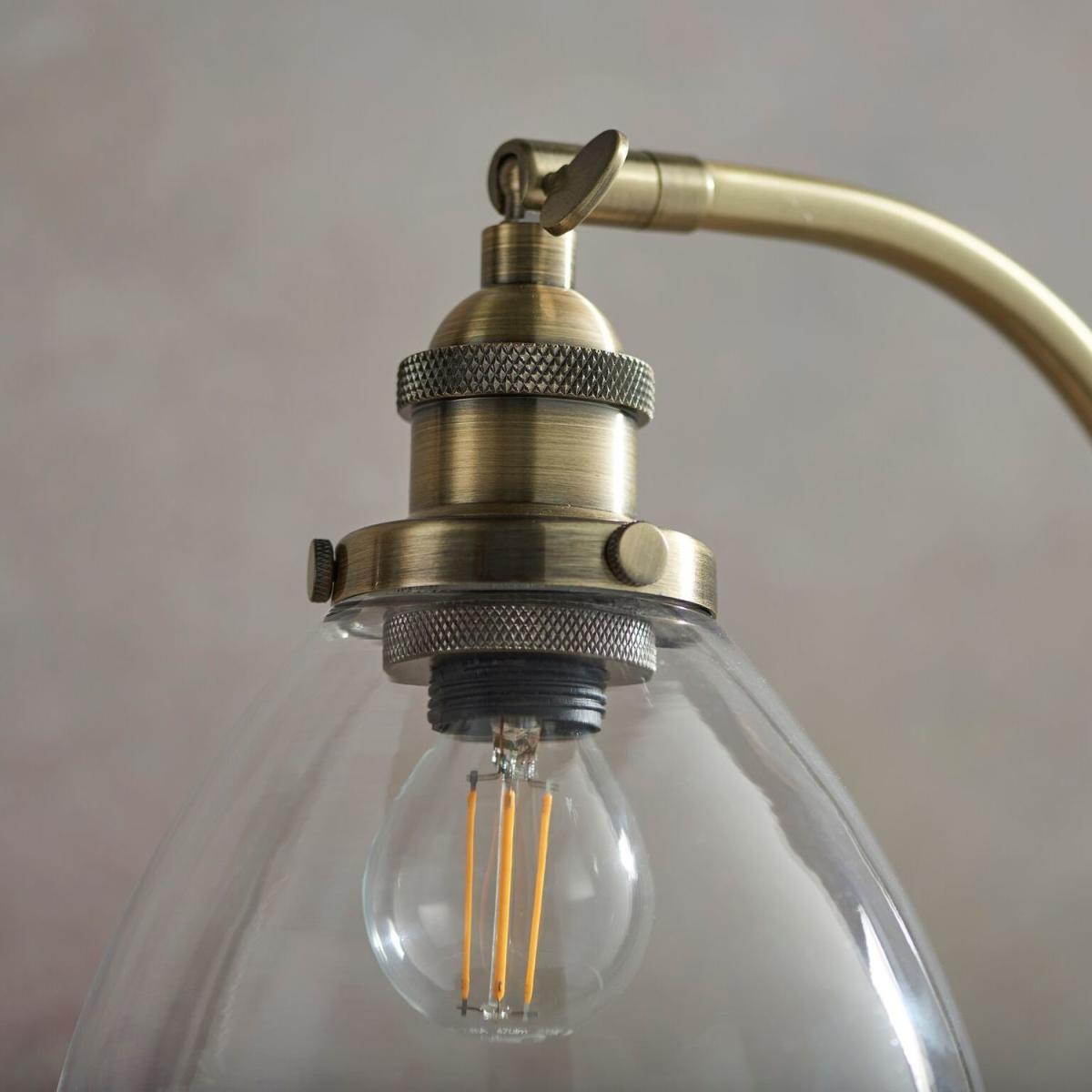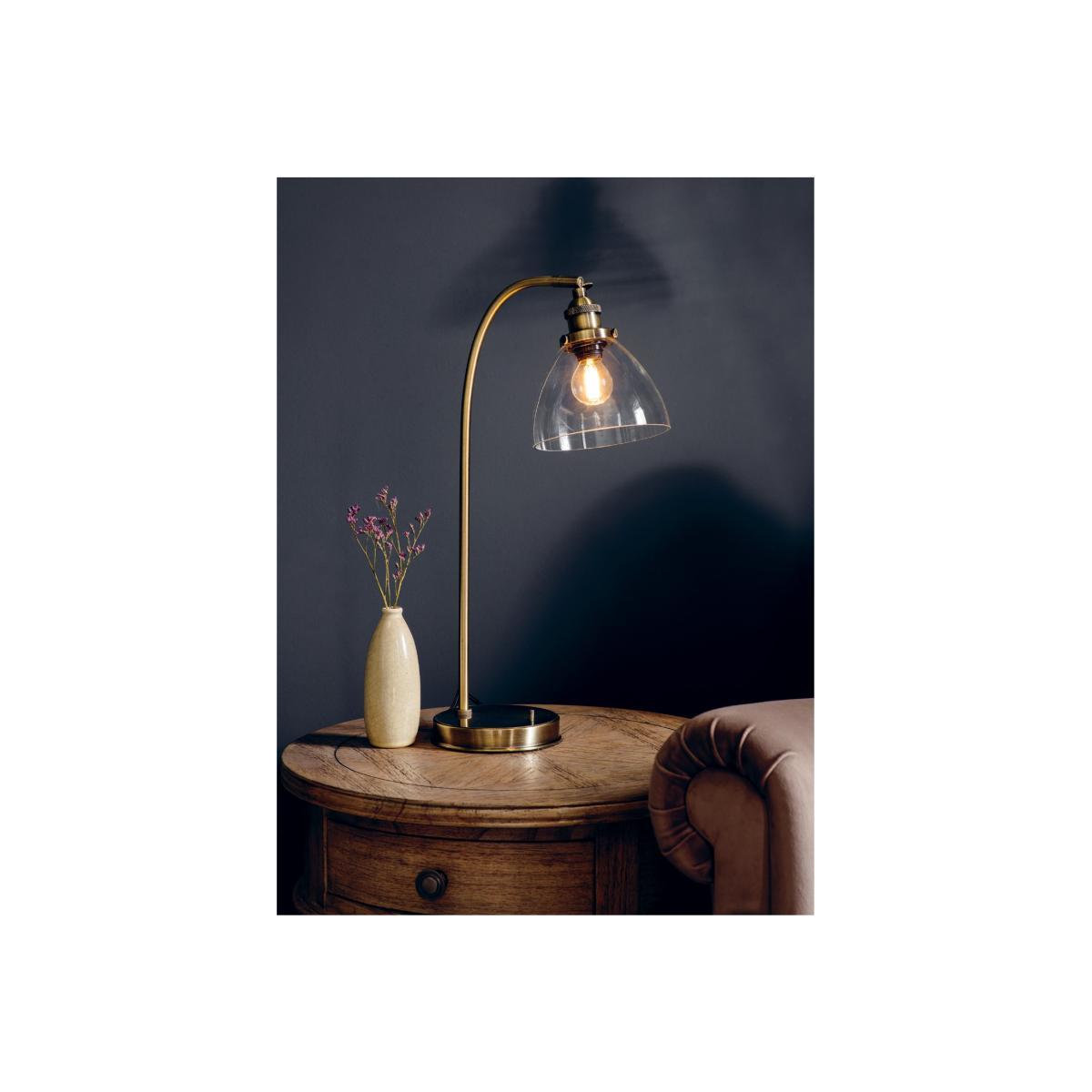 The Hansen is a retro industrial style adjustable table lamp finished in antique brass plating with a clear glass shade.