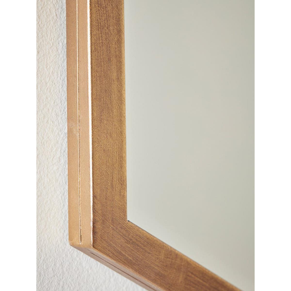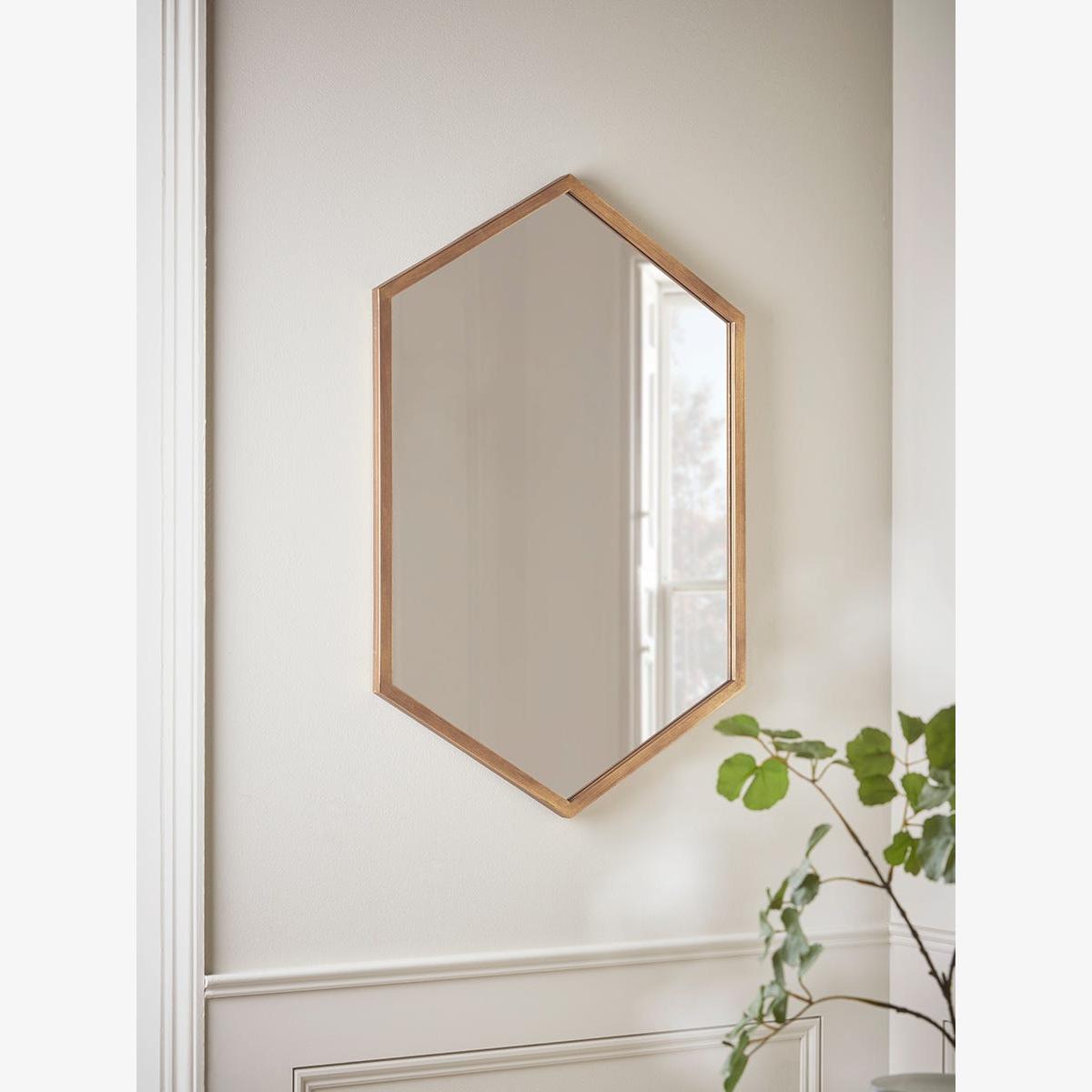 Elevate a blank wall or darker corner of a room with this statement mirror. Featuring a drawn out hexagonal frame in a warm brass toned metal and glass with a bevelled edge, it provides a variation on the classic gold framed mirror that will suit both contemporary and traditional interiors.