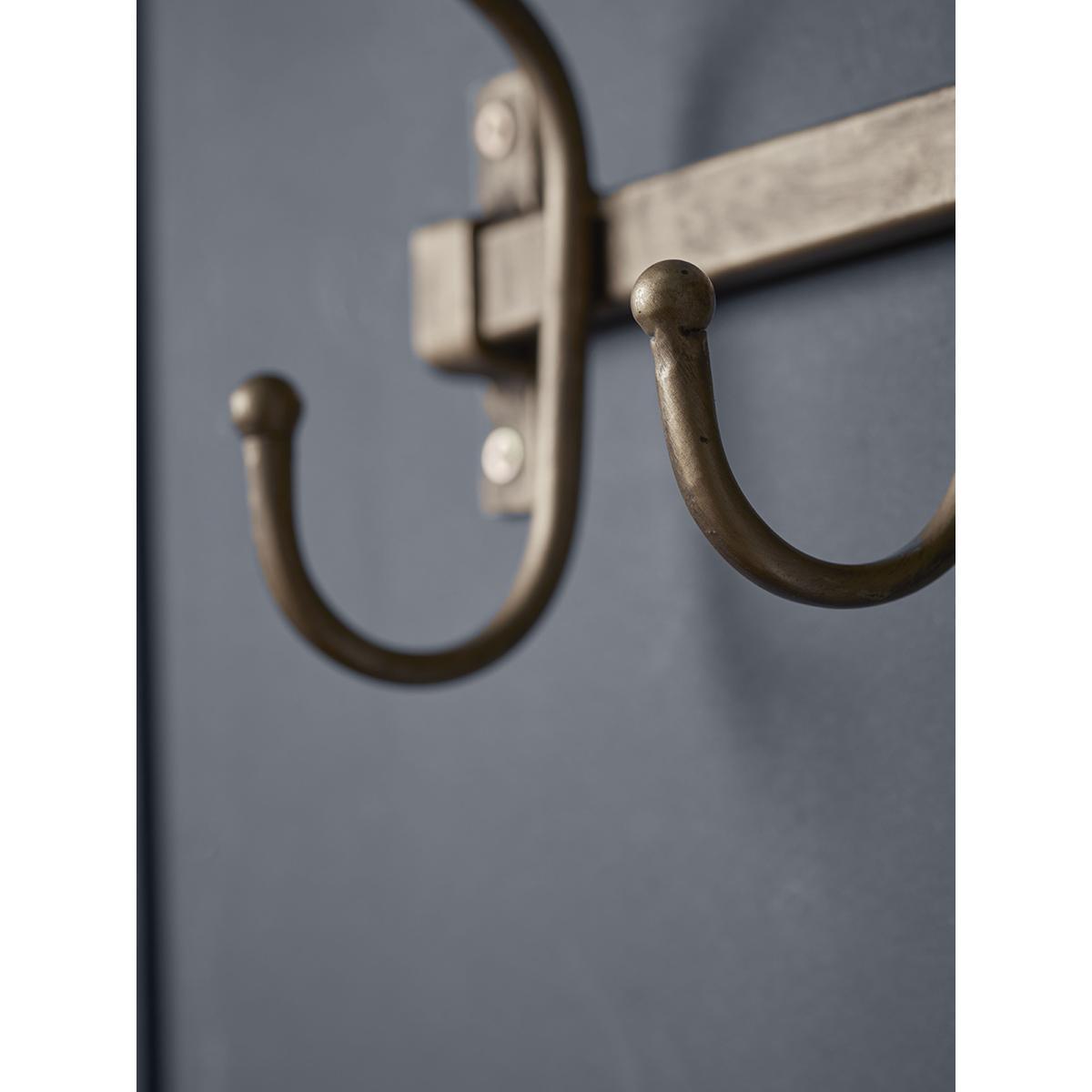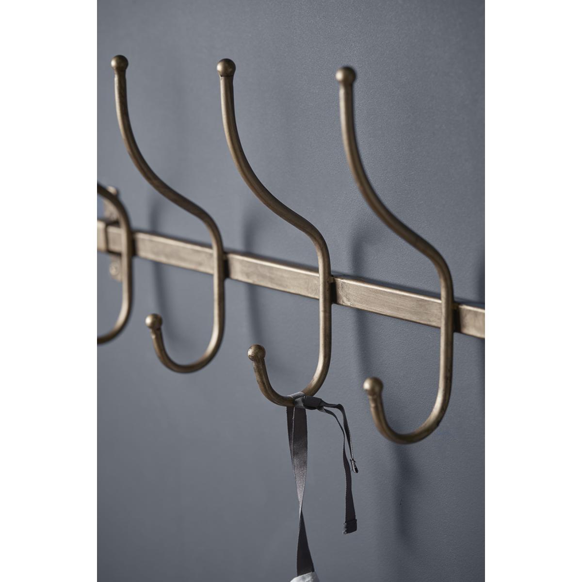 Four slender, elongated hooks mounted in a row upon a narrow feature back plate, with a burnished gold finish. A tidy, elegant spot on which to hang your coat or robe.