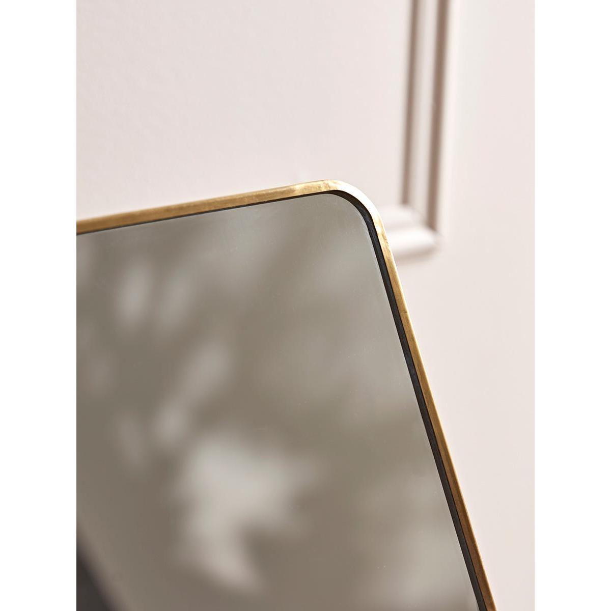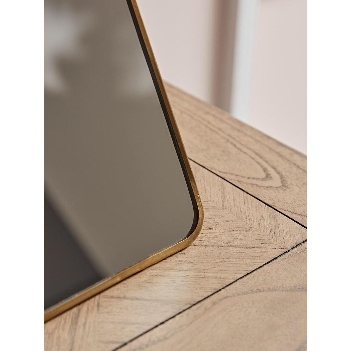 A timeless mirror that’s ideal for the top of a chest of drawers or dressing table in the bedroom. With a simple slim frame, antique brass toned finish and integral stand, the compact form of this mirror only adds to its versatility.