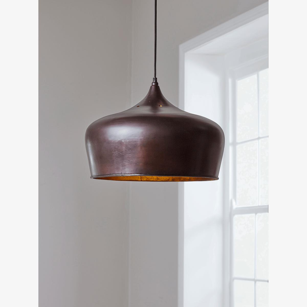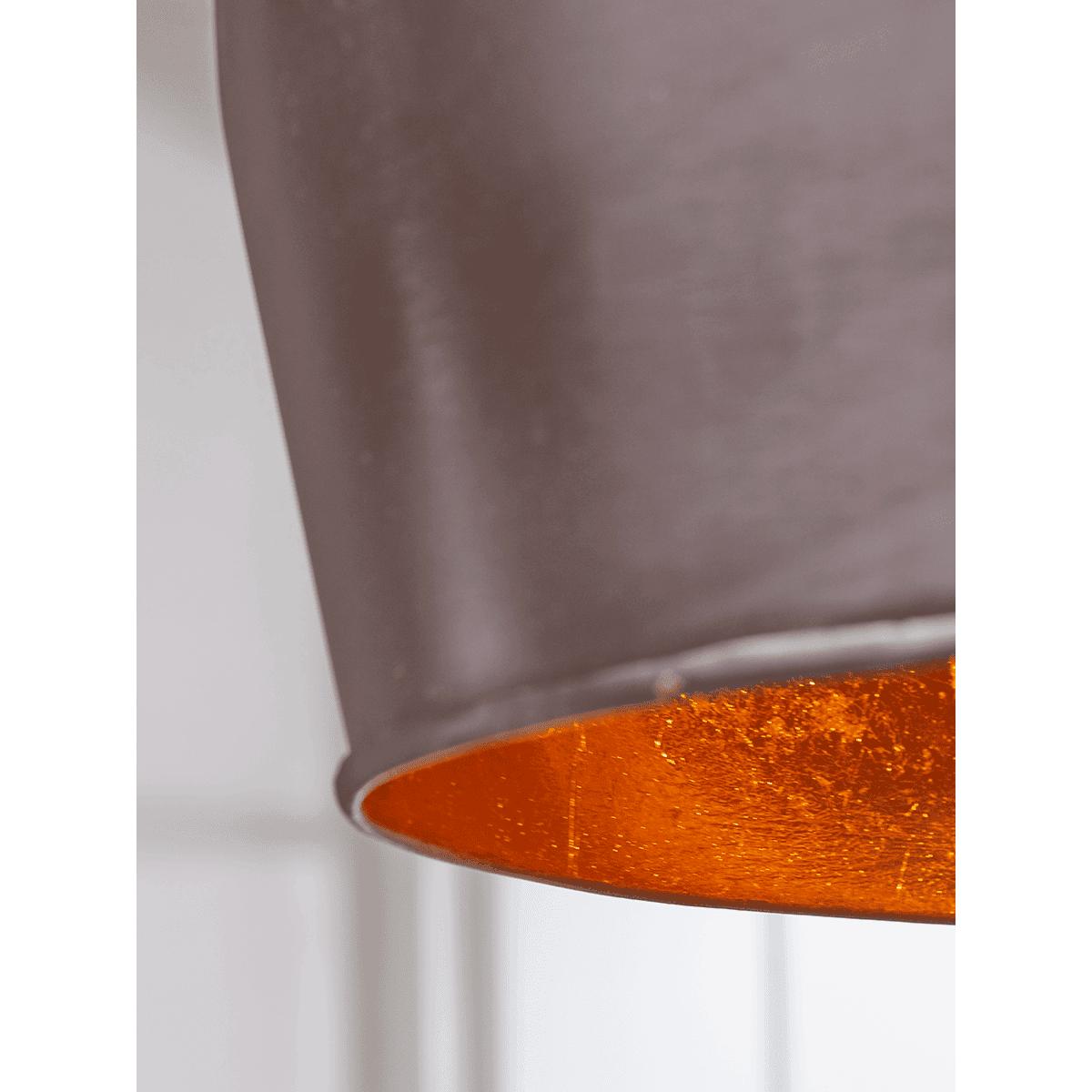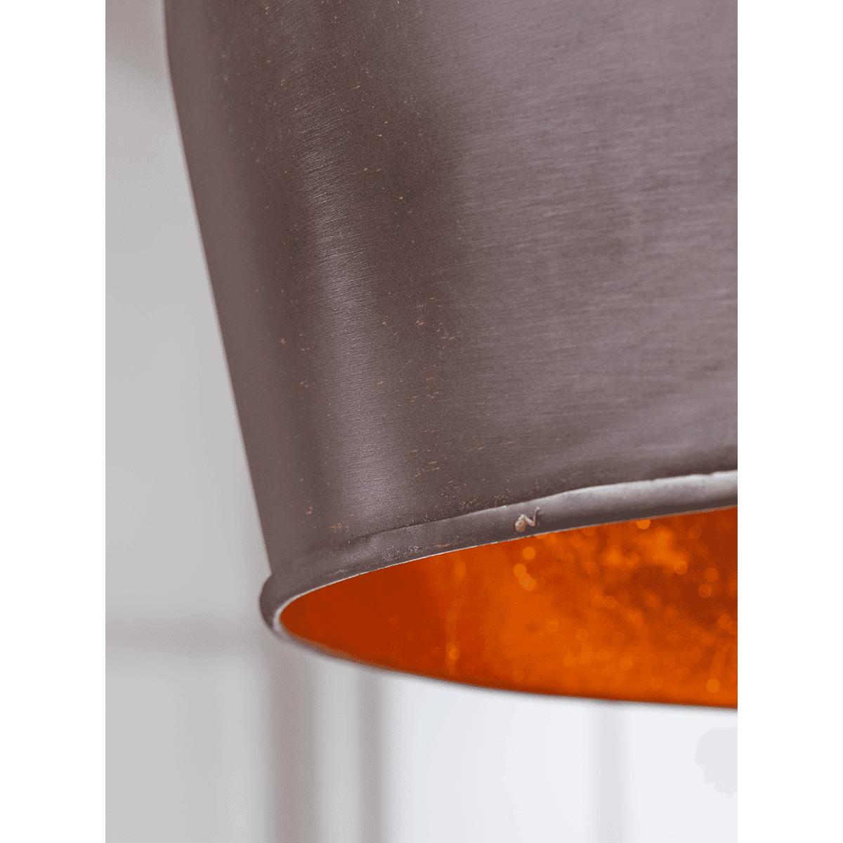 An industrial inspired dome pendant to make a strong statement feature in your home. Here, the hard working material of the shade, finished in a burnished copper, holds the luxe metallic copper inner beautifully; the matte, worked surface contrasting with the reflective element to a wonderful effect. Hang above your dining area or pair together in your kitchen space to make an impact in a contemporary setting.