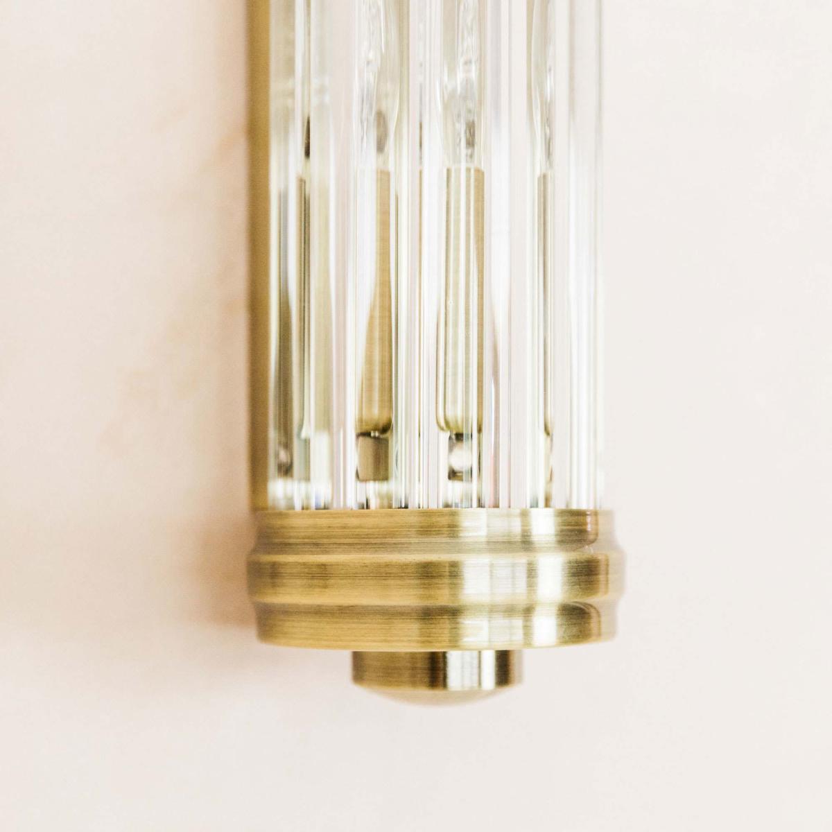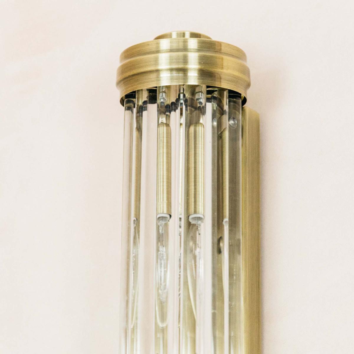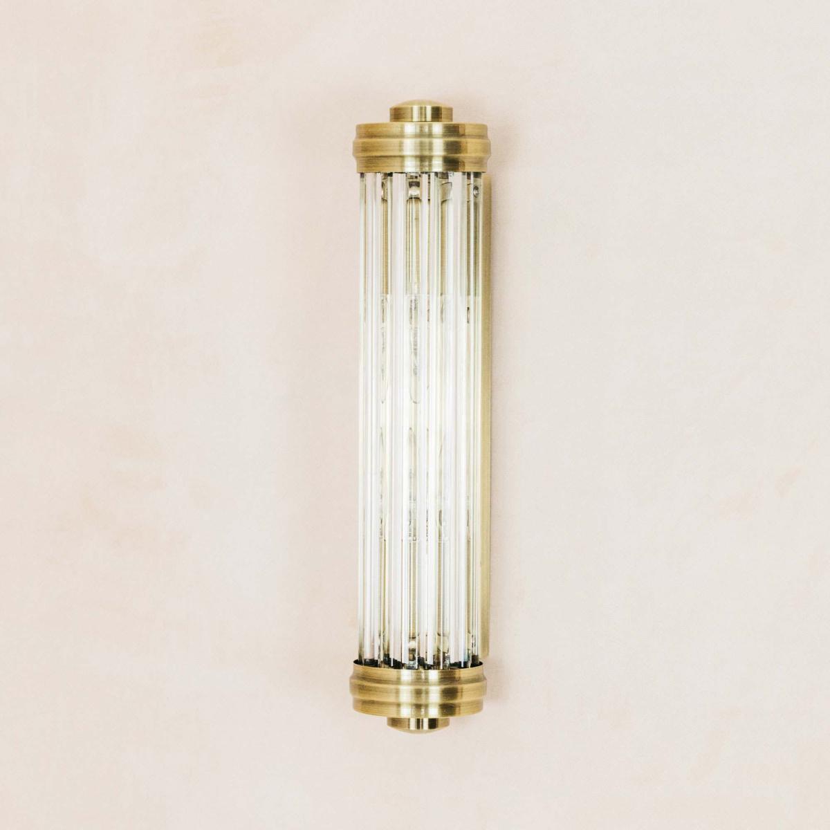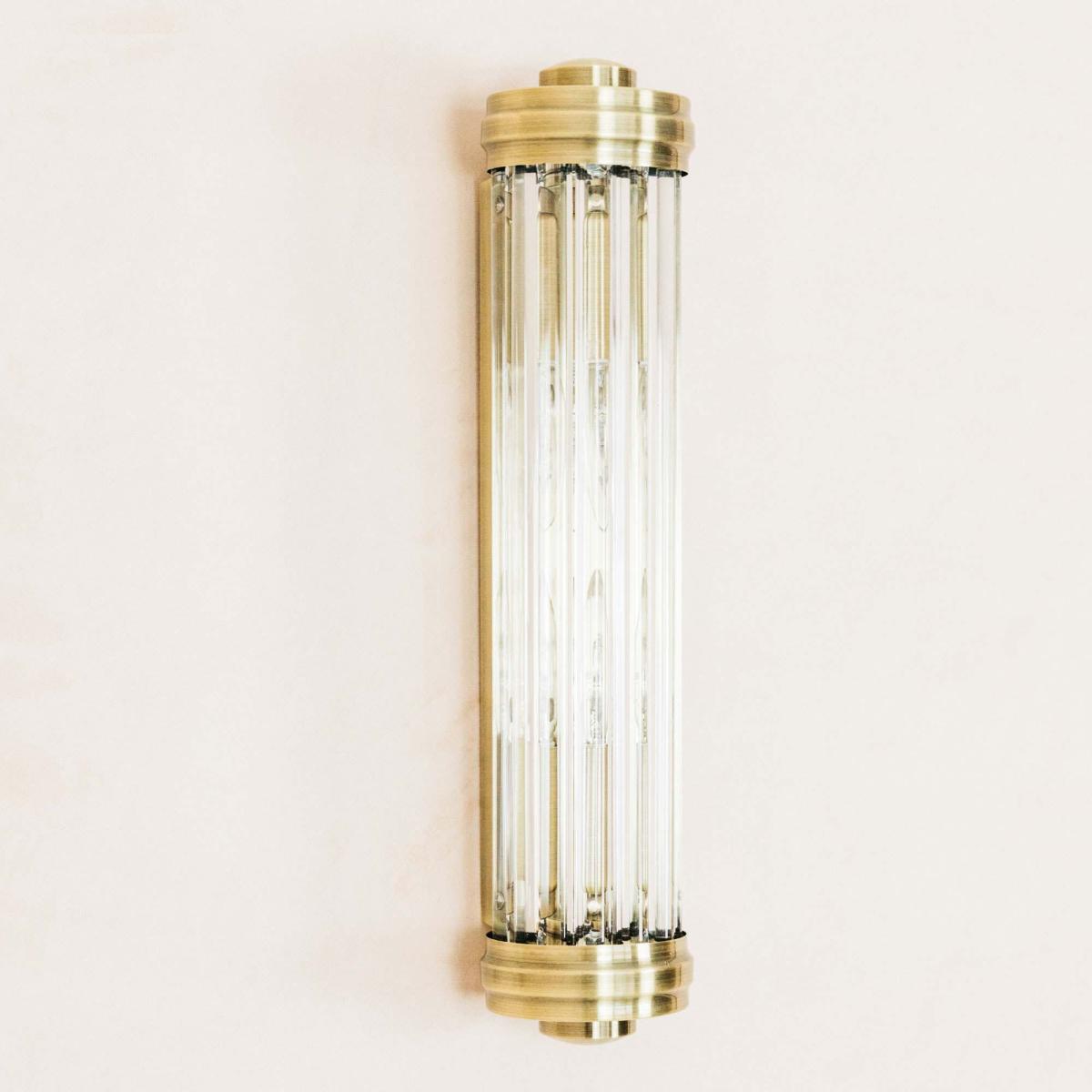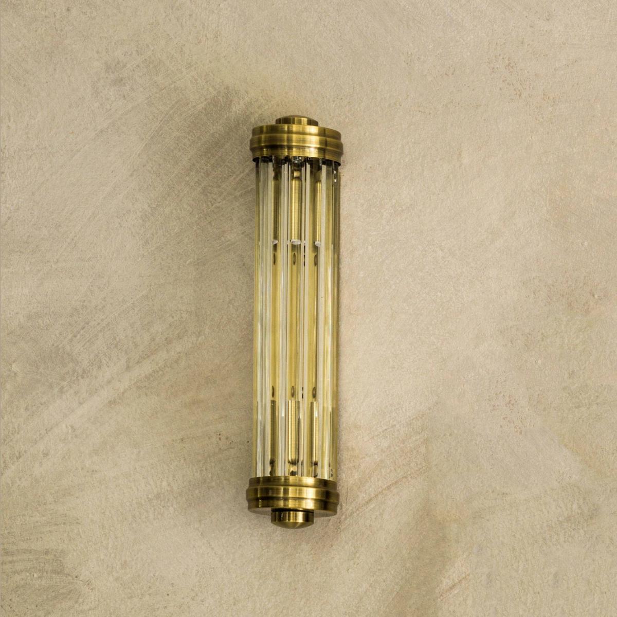 An art deco inspired wall light featuring a long, narrow tubular design, crafted from clear glass and steel with an antiqued finish.