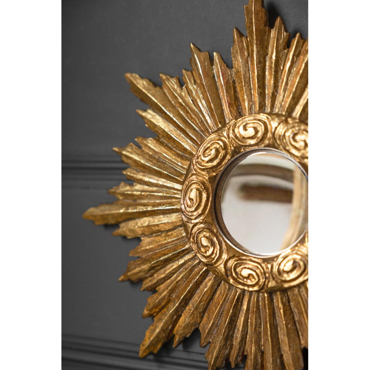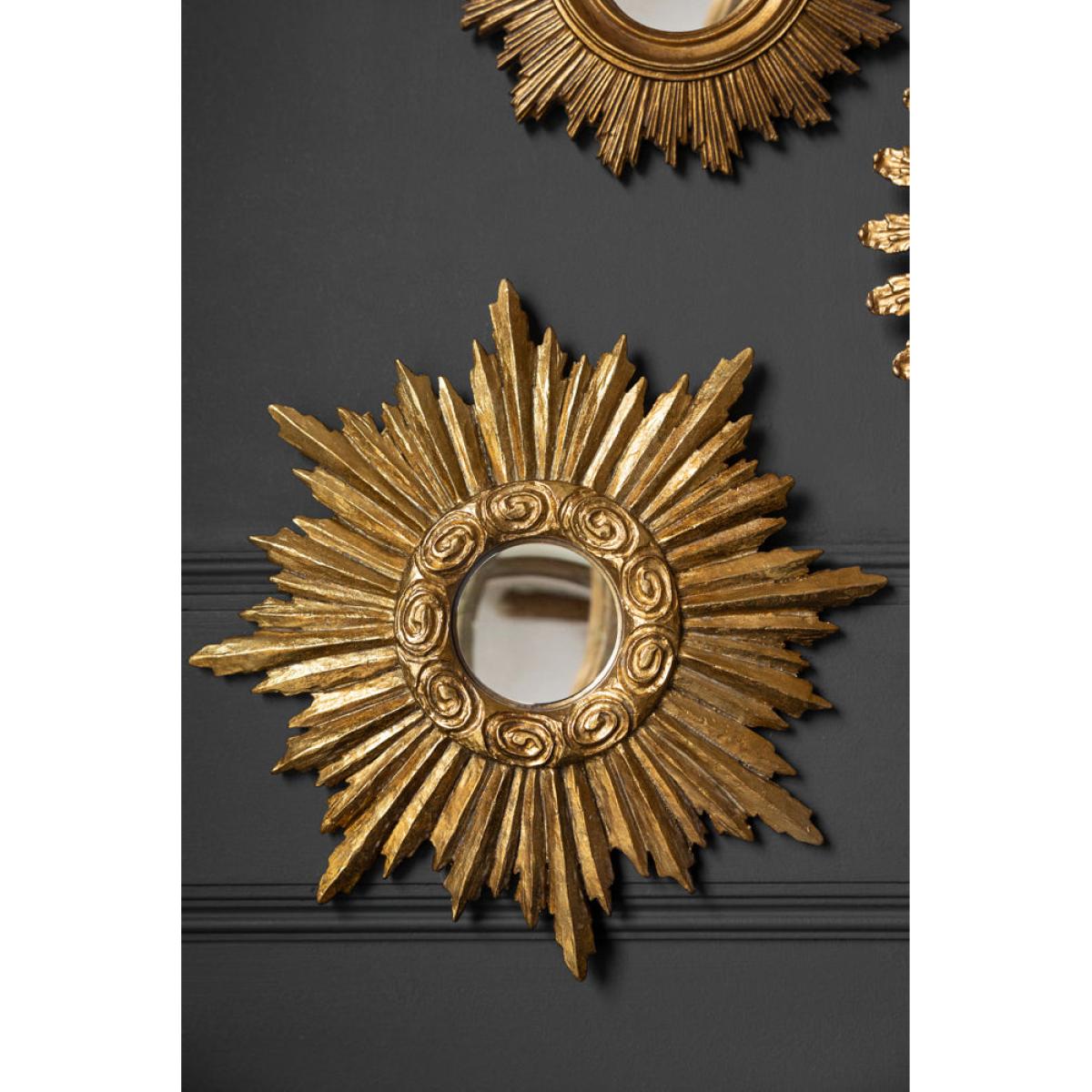 About The Antique Gold Small Star Convex Mirror The Antique Gold Small Star Convex Mirror is a gorgeous piece that promises to add wonder to your walls. Designed with a unique frame that captures the look of a shooting star, the ornate detailed border and convex mirror inside help to create a statement wall mirror for any setting. Measuring H25cm x W25cm x D1.4cm, the gold mirror joins our collection of fabulous convex mirrors that can be styled together on the walls of your home. Why We Think You’ll Love The Gold Wall Mirror Mirrors are a must-have accessory for any home and are a great way to introduce a feeling of light and space to smaller rooms and darker corners. Transforming the mirror from a practical feature to a statement styling trick, the gorgeous antique gold frame and quirky convex mirror make this mirror a fabulous piece of wall art. Joining our growing collection of glamorous convex mirrors, the Antique Gold Small Star Convex Mirror can be styled solo propped up on a shelf or introduced to a gallery wall of gorgeous, statement mirrors.