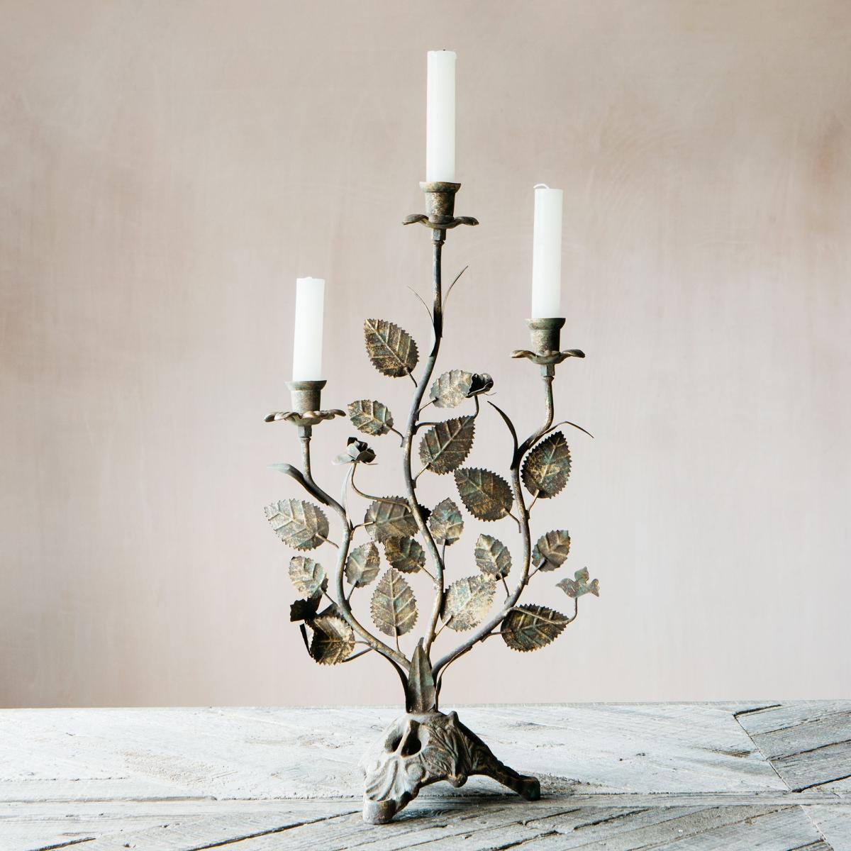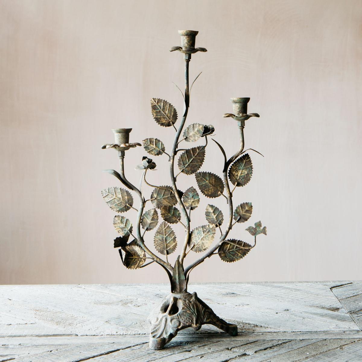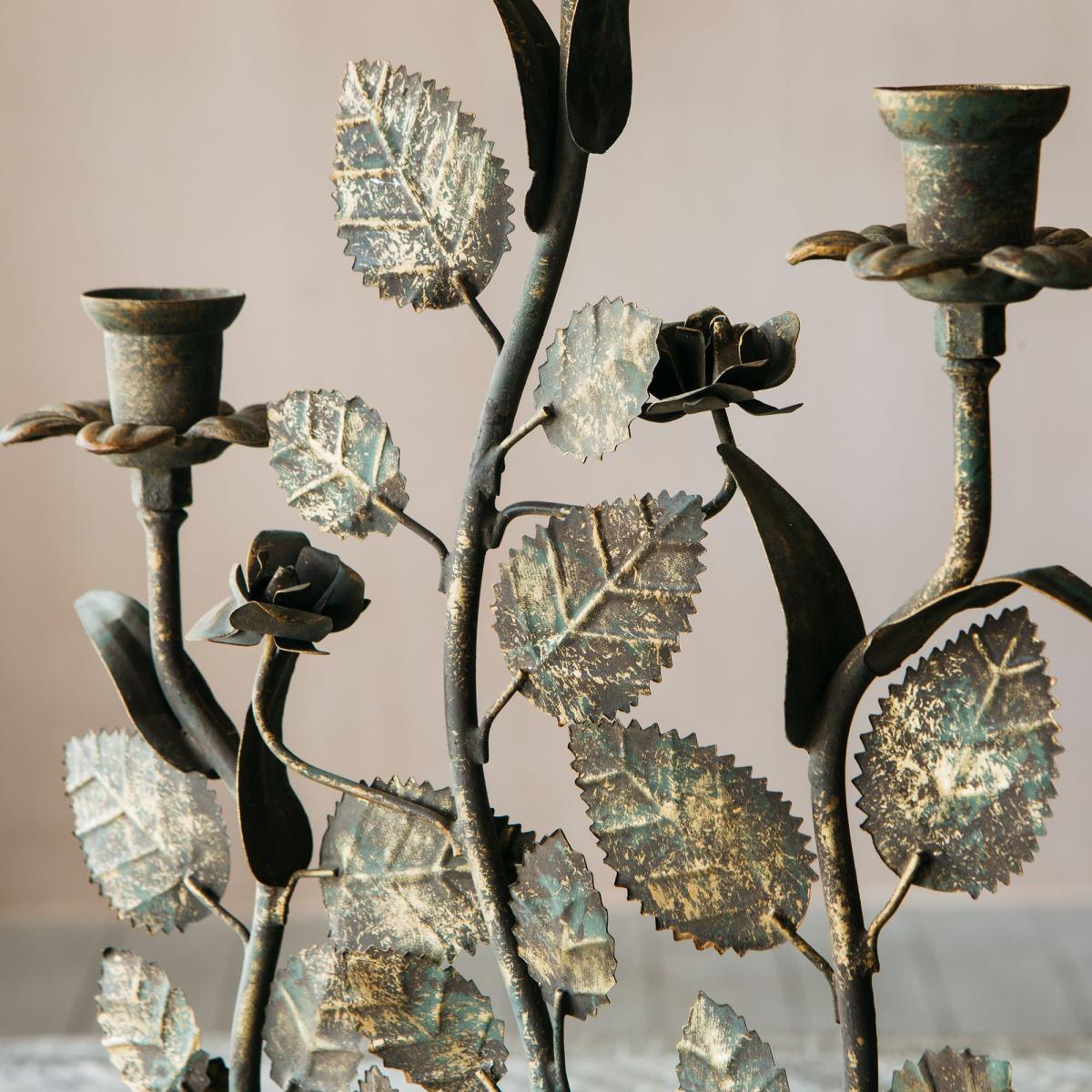A romantic leaf candelabra for your mantlepiece or dining table made of iron with an antiqued finish.