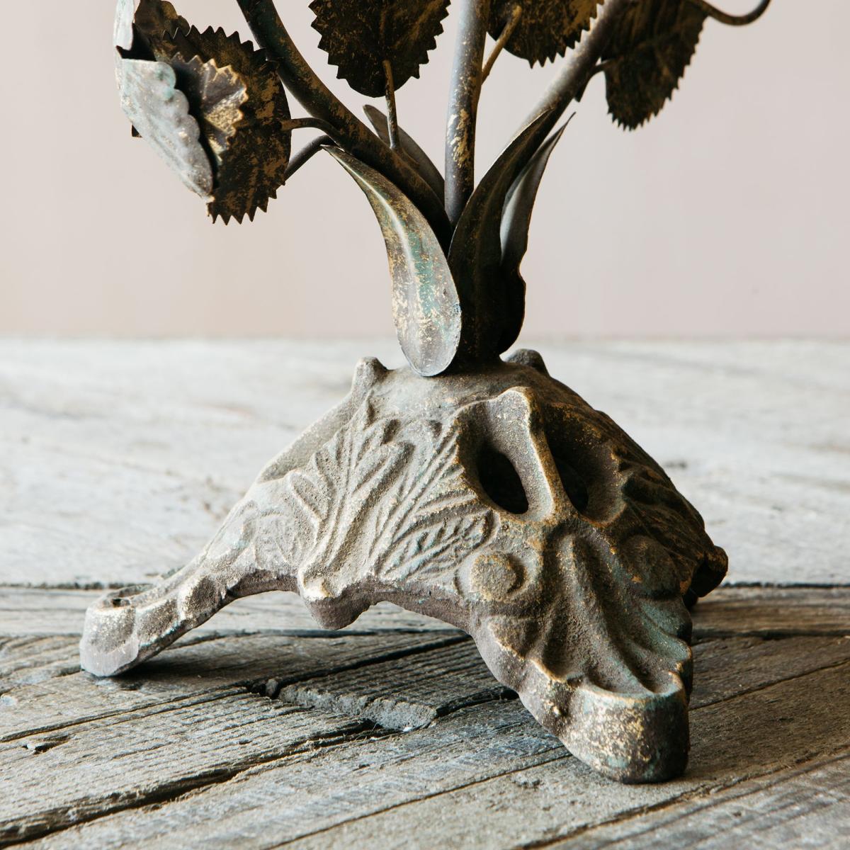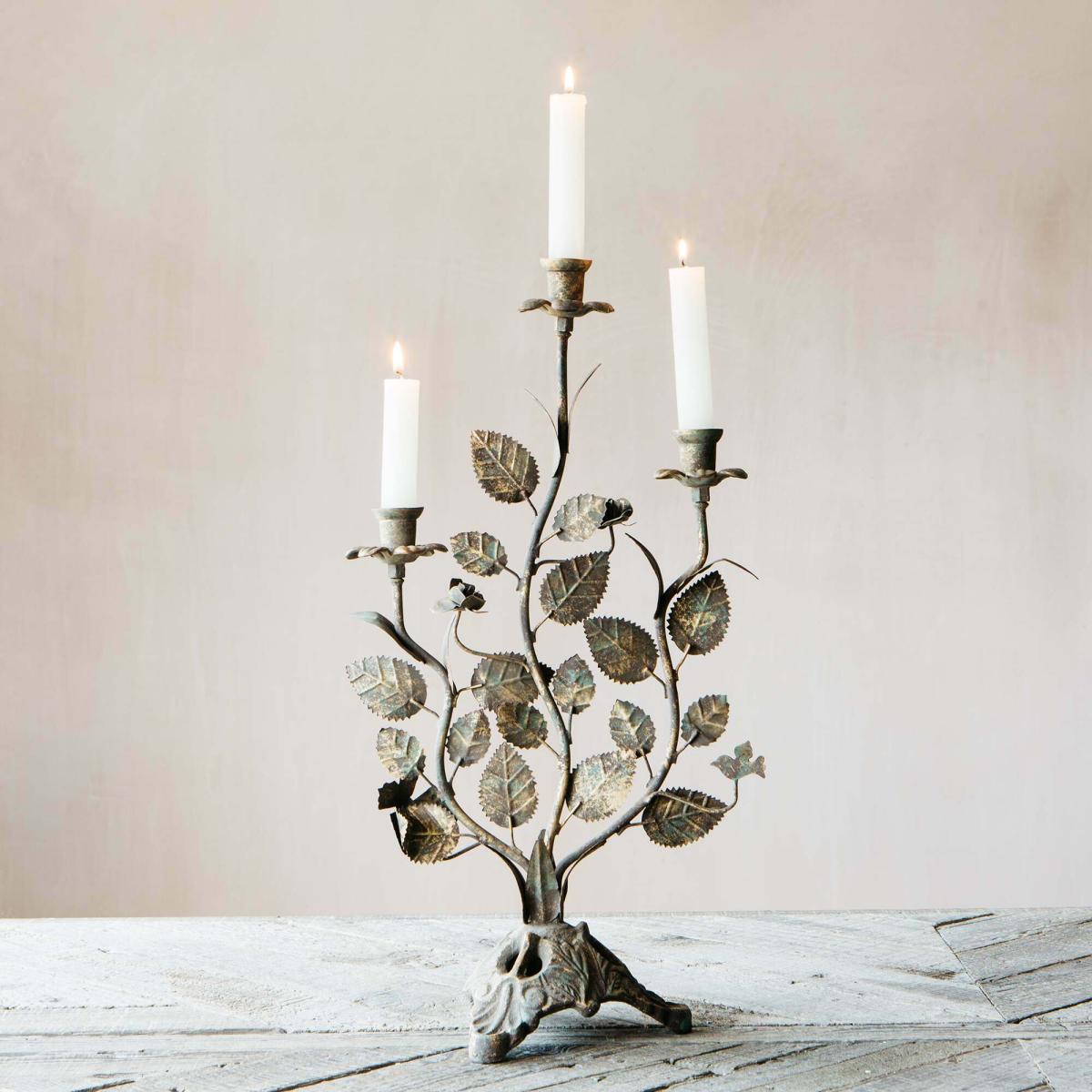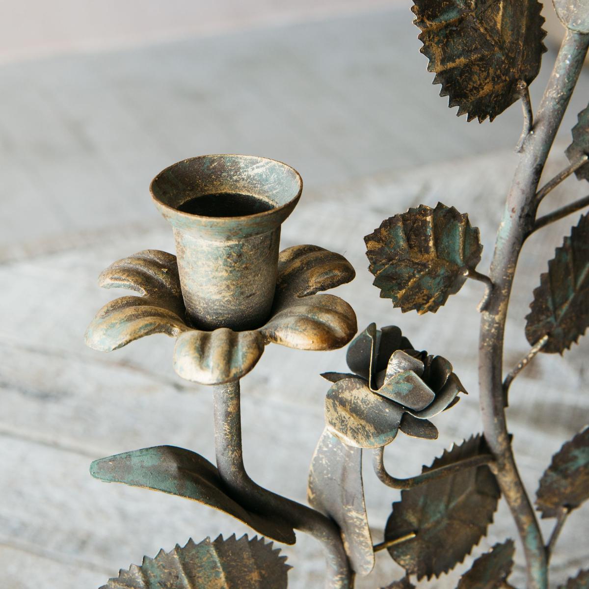 A romantic leaf candelabra for your mantlepiece or dining table made of iron with an antiqued finish.